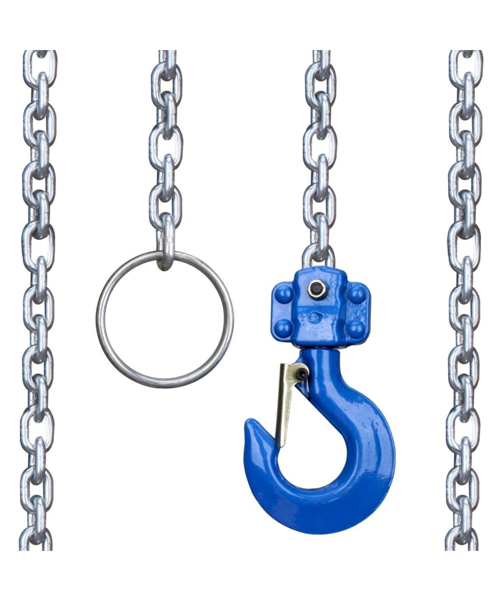 La chaîne en acier de 6 m de long a une épaisseur de 8 mm et convainc par sa robustesse. Les étriers de sécurité sont pivotants et permettent une manipulation simple et sans complications. Elles empêchent en outre la charge de se détacher du train. - Crochet rotatif à 360° & fonction roue libre