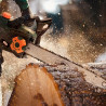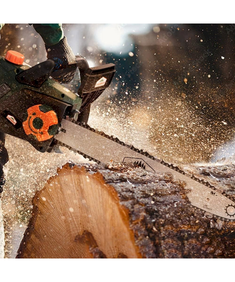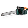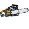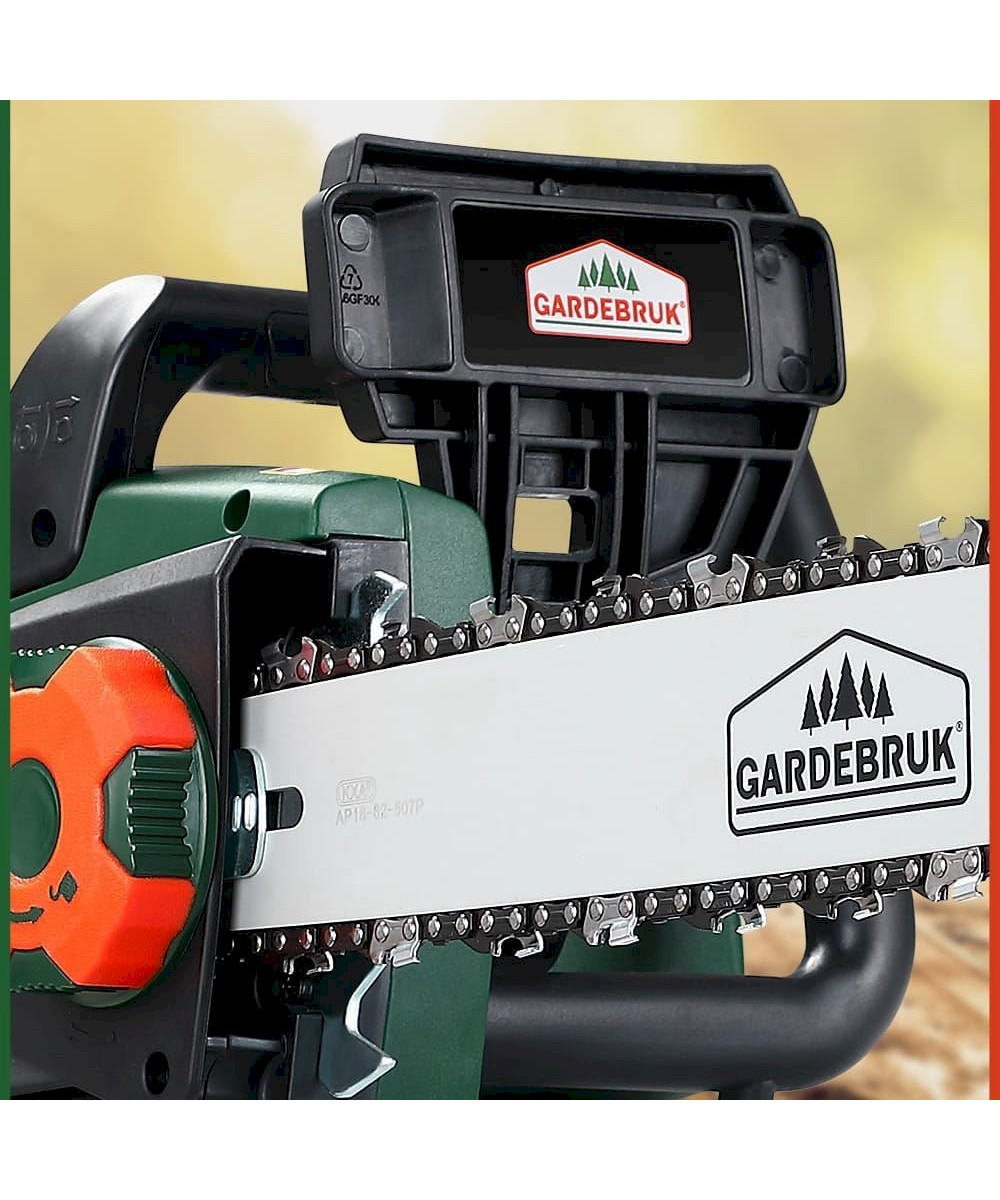 La chaîne de qualité guidée par engrenage est accélérée par un pignon d´entraînement métallique solide à une vitesse de 16 m/s. Elle assure donc une excellente performance de coupe. La tronçonneuse dispose également d´une lubrification automatique de la chaîne et d´une tension rapide de la chaîne , sans avoir besoin d´un quelconque outil.