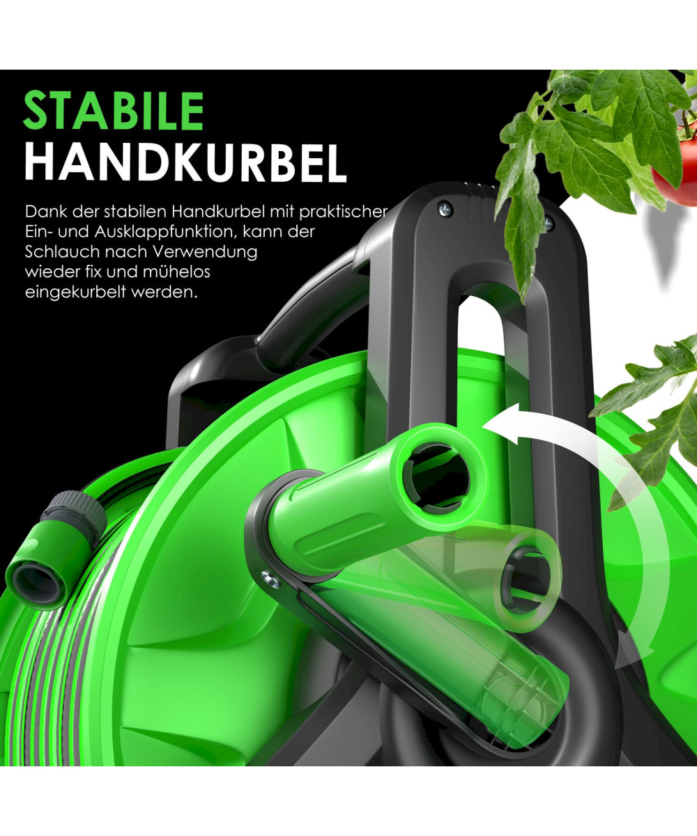 Der Schlauch wird perfekt aufgewickelt, wodurch ein verknoten beim Herausziehen ausgeschlossen ist. Zudem ist unsere Schlauchtrommel flexibel und mobil einsetzbar, wodurch Sie auch Ihren Vorgarten einfach erreichen können. Für noch mehr Komfort können sie mehrere Wandhalterungen auf Ihrem Grundstück anbringen, dadurch können Sie die Schlauchtrommel je nach Wunsch und Einsatzgebiet an der vorgesehenen Vorrichtung anbringen. Mitgelieferte Schrauben und Dübel sorgen für eine schnelle und unkomplizierte Montage. Durch das Gesamtgewicht von nur 5,8 Kg und einem ergonomischen Griff können Sie die Schlauchbox ganz unkompliziert von A nach B transportieren.
