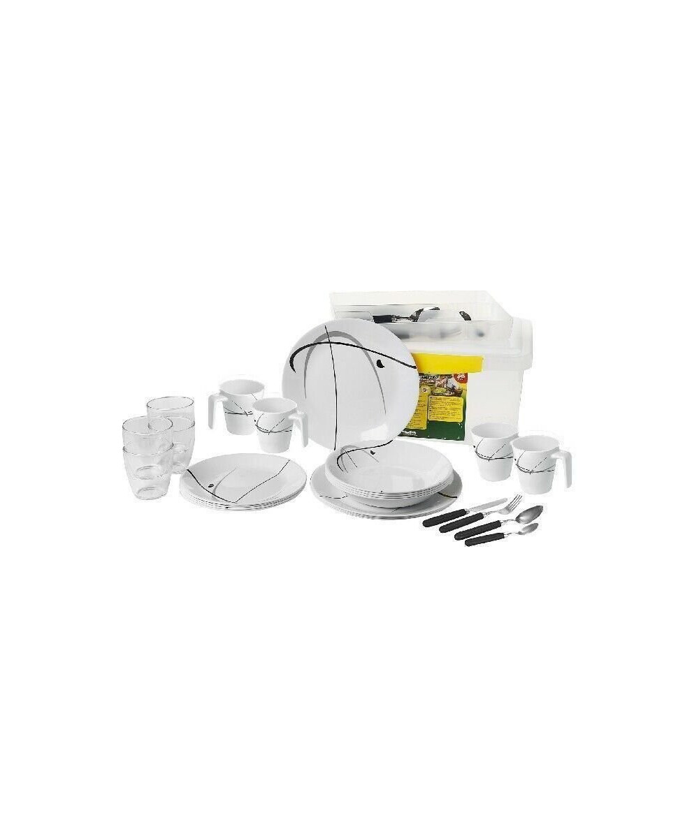 Ensemble complet de vaisselle de 36 pièces avec boîte de transport. Toutes les pièces sont dotées d'un système antidérapant.