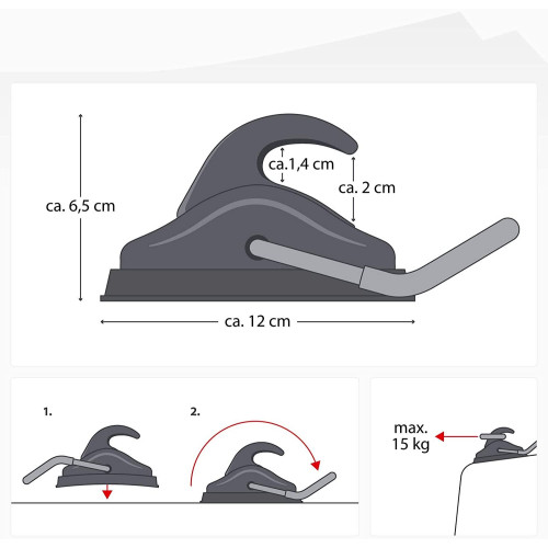 Poser tout simplement la ventouse sur une surface dégagée, abaisser le levier et le vide ainsi créé maintient la crochet sur la surface. Le grand crochet peut être utilisé pour accrocher une boucle ou une corde de fixation ou le set de barres de toit Qeedo Connector est tout simplement suspendu au crochet. - Ventouse en caoutchouc avec levier