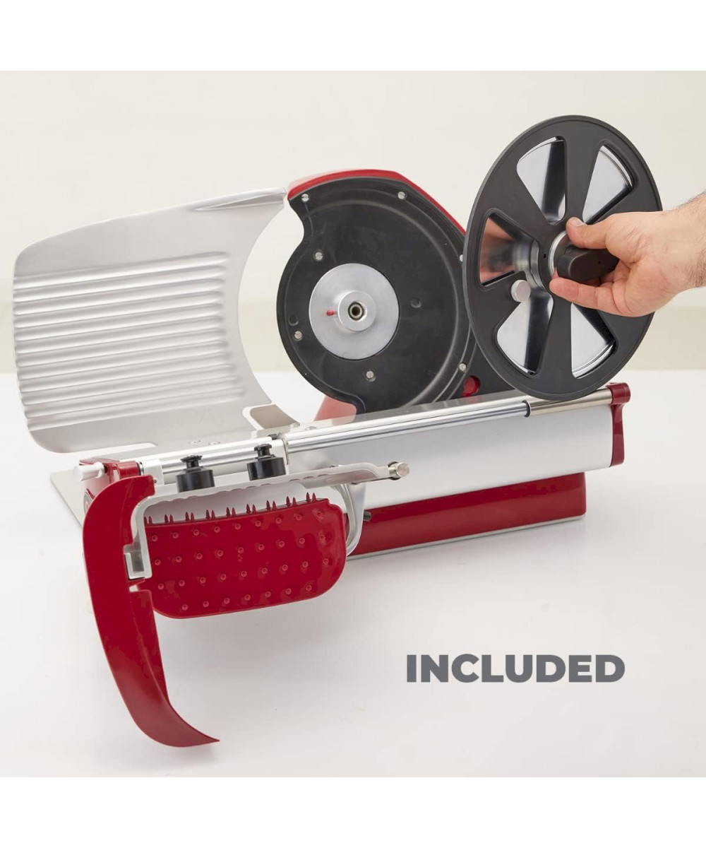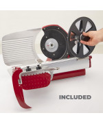 - Messer aus verchromtem Stahl mit professionellem Profil: reduziert Schneidabfälle und gewährleistet gleichmäßige Scheiben
