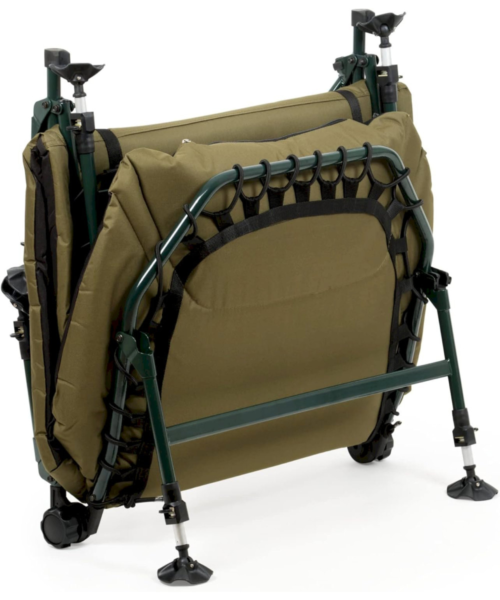 Die Karpfenliege hat einen Metallrahmen, der auch hohe Belastungen problemlos tragen kann. Die 8 höhenverstellbaren Füße verfügen über Schlammteller, die ein Einsinken auf weichem Boden verhindern.
