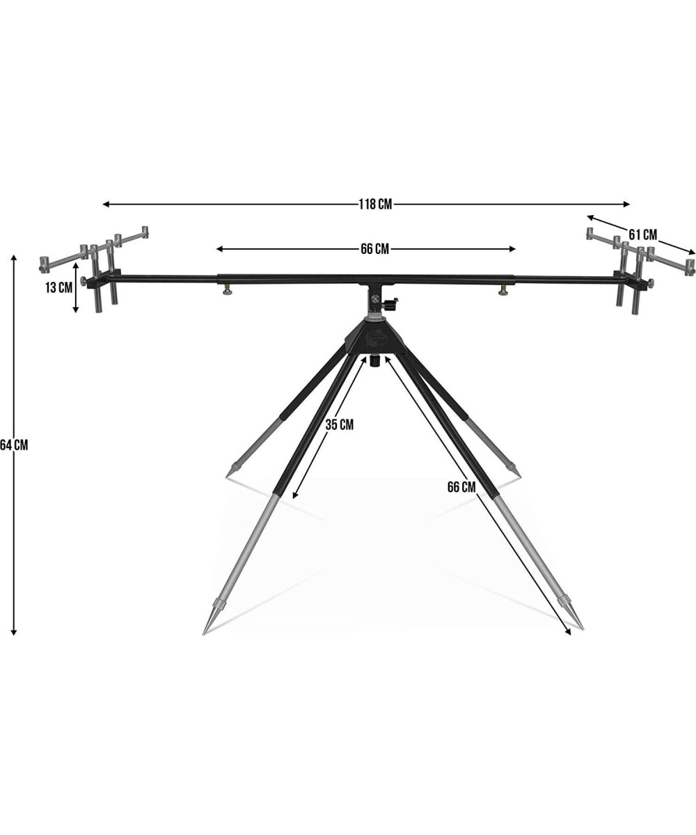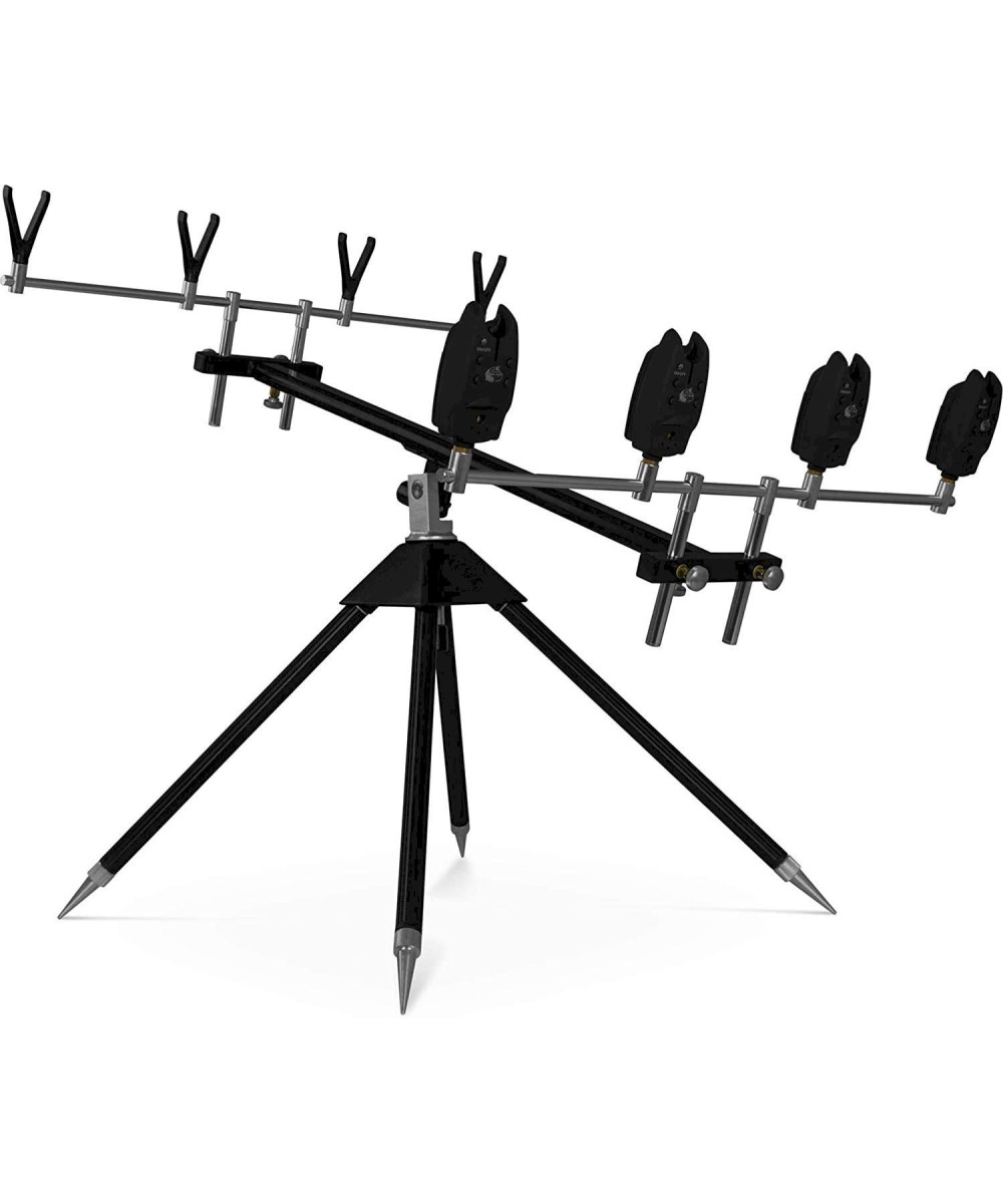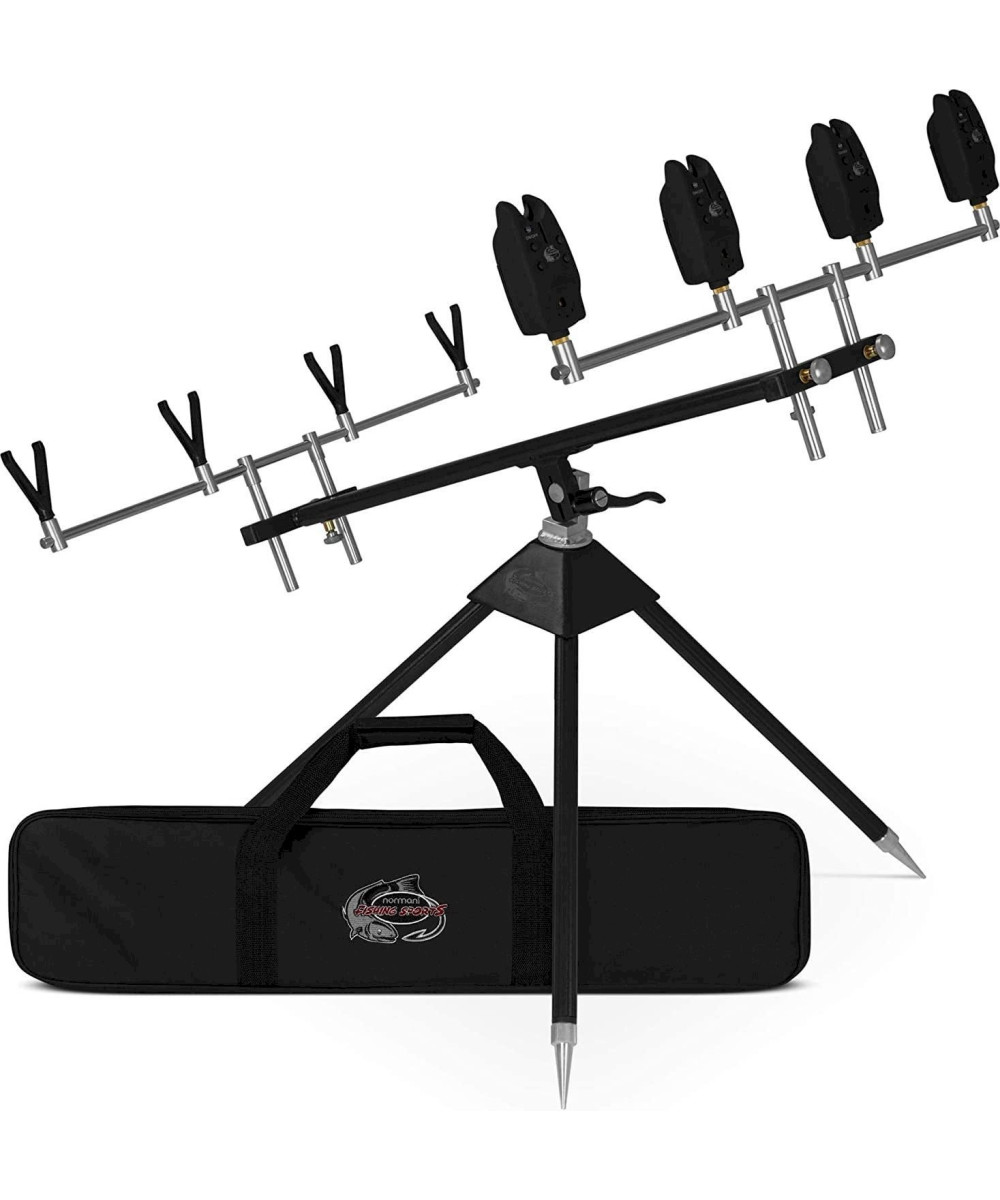 Der Rutenhalter „Villajoyosa“ aus robusten, schlag- und stoßfestem Aluminium ist eine hoch-qualitative Konstruktion, die auf keinem Angelausflug fehlen darf. Vierbein Rutenhalter mit teleskopierbaren Beinen und spitzen Enden sorgen für einen sicheren Stand auf unebenen Untergründen. Die Standbeine lassen sich in der Höhe um 35 cm ausfahren. Die Mittelstange lässt sich um 360° drehen und ebenfalls individuell in seiner Länge von 66 cm bis 118 cm verstellen und eignet sich daher perfekt für alle gängigen Rutengrößen. An Uferböschungen in unmittelbarer Wassernähe, am Fluss, See oder Kanal lässt sich der Rutenhalter individuell nach den eigenen Erfahrungen und Wünschen ausrichten. Per Drehverschluss wird die Mittelstange fixiert. Beidseitig verfügt der Rutenhalter über Buzzer Bars, die stufenlos zu einer Höhe von 13 cm skalierbar sind. Schnellschraubverschlüsse dienen der Fixierung der Buzzer Bars und lassen die Höhe der Rutenauflage anpassen. Vier Gewinde auf jeder Seite bieten Platz für alle gängigen Rutenauflagen und Bissanzeiger. Mittelstange und Buzzer Bars lassen sich durch Neigung der Wasserquelle ausrichten. Ideal fürs nächste Karpfenangeln. Die Rutenauflage ist in wenigen Schritten zerlegbar und wird in der hochwertigen Tragetasche verstaut. Somit ist der Transport und die Aufbewahrung besonders bequem und einfach. Optimale Stangeneigenschaften, stufenlos in Höhe und Länge teleskopierbar, neigbar, mit verstellbaren Standfüßen und individuellen Buzzer Bars für Auflagen und Bissanzeiger für 4 gängige Ruten, sind die optimalen Eigenschaften für einen erfolgreichen Anglertag. Bissanzeiger mit LED-Beleuchtung und stufenloser Lautstärkenregelung. Universell einsetzbare V-Rutenauflage. Die V-Form verhindert das Rutschen und Springen der Rute.