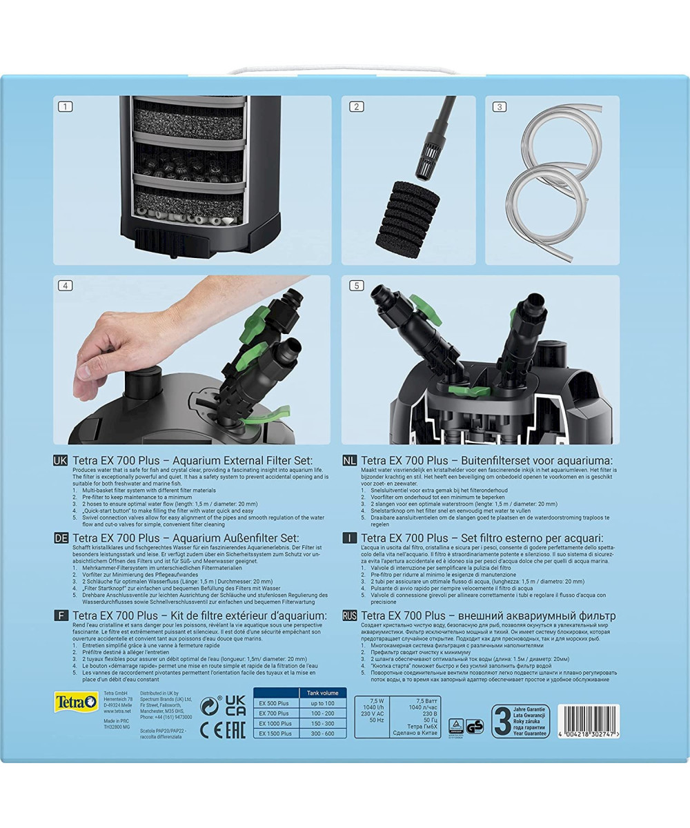 Damit Ihre Fische und Pflanzen gesund bleiben, muss das Aquarienwasser kontinuierlich gefiltert werden. Das Tetra EX Plus Außenfilter-Komplettset gewährleistet eine ausgezeichnete Wasserqualität für Fische in Aquarien mit einem Volumen von bis maximal 200 l. Alle Filtermaterialien sind im Lieferumfang enthalten, sodass Sie den Filter sofort in Betrieb nehmen können. In mehreren Kammern wird das Wasser mit unterschiedlichen Filtermaterialien zuverlässig und effizient gereinigt, indem überschüssige Nährstoffe abgebaut werden. So erhalten Sie kristallklares und fischgerechtes Wasser für ein faszinierendes Aquarienerlebnis. Darüber hinaus ist das Tetra EX Plus Außenfilter-Komplettset mit seiner um bis zu 27 % höheren Durchflussrate * besonders leistungsstark und dabei energieeffizient und leise. Dank Ansaughilfe zum Schnellstart des Filters, Ventilen zur präzisen Regulierung des Wasserdurchflusses und Vorfilterfunktion zur Verringerung des Pflegeaufwands ist das Tetra EX Plus Außenfilter-Komplettset die ideale Wahl für alle Aquarienbesitzer.