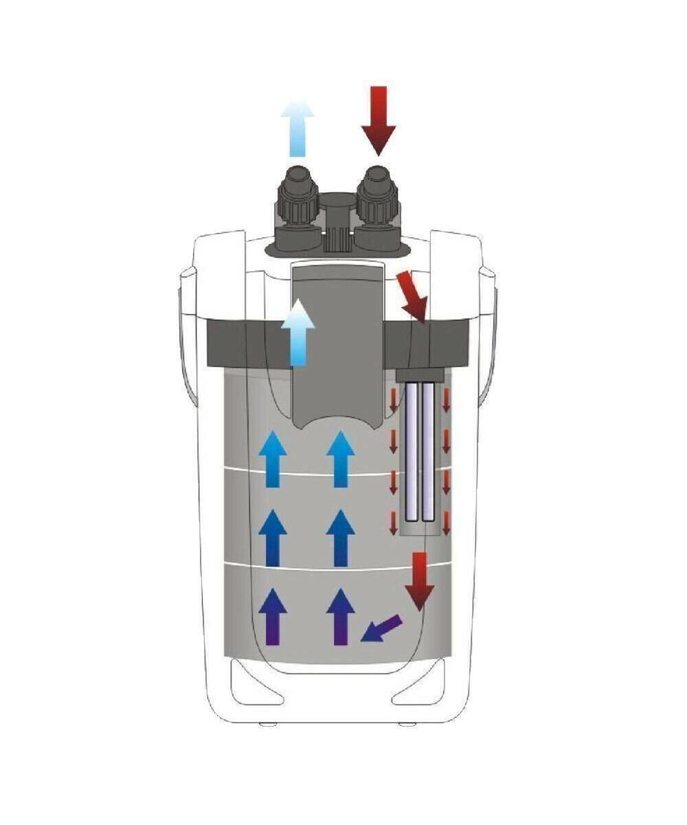 Die Wasserführung innerhalb des Aquarienfilters sorgt dafür, dass das Aquarienwasser zuerst an der UVC-Klärer-Einheit vorbei geführt wird. Durch die UVC-Strahlung dieser UV-Lampe werden schädliche Algen, Bakterien und Krankheitskeime abgetötet und die Algenbildung bleibt unter Kontrolle.