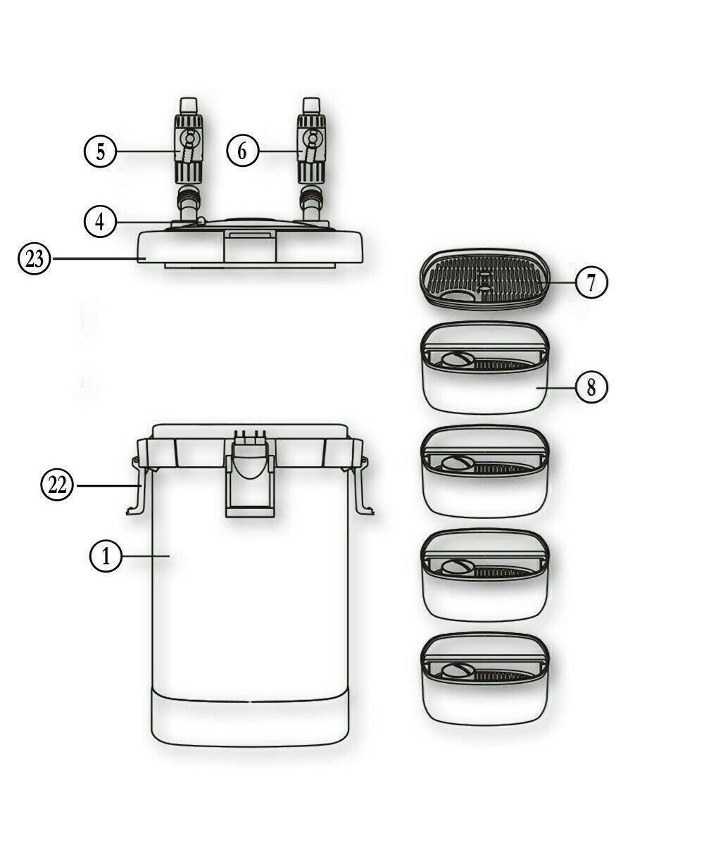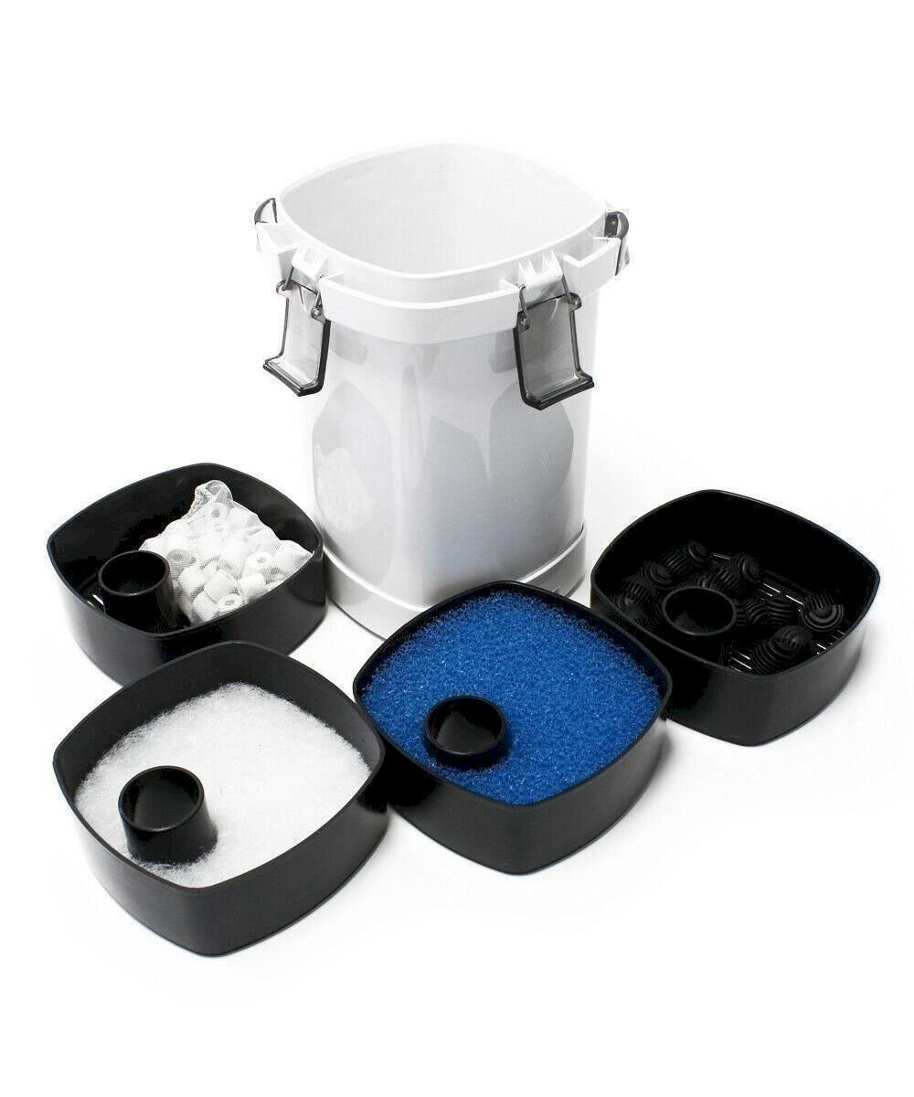 Der Aquarienfilter wird mit Filtermedien für die 4-Filterstufen geliefert. Die Filterkörbe mit praktischen Handgriffen können individuell mit dem Filtermaterial befüllt werden. Beachten Sie dabei, dass die Filtermaterialien von grob auf fein abgestuft werden müssen. Die oben liegende 1. Filterstufe, der sog. Vorfilter, hält Grobschmutz effizient zurück und verlängert die Standzeit des biologischen wirkenden Filtermaterials, das sich in den darunter liegenden Filterstufen befindet, erheblich. Der Vorfilter kann einfach entfernt werden und ist leicht zu reinigen.