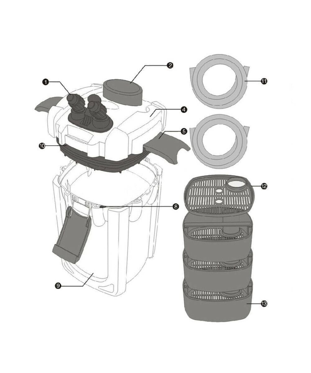Der Aquarienfilter wird mit Filtermedien für die 3-Filterstufen geliefert. Die Filterkörbe mit praktischen Handgriffen können individuell mit dem Filtermaterial befüllt werden. Beachten Sie dabei, dass die Filtermaterialien von grob auf fein abgestuft werden müssen. Die oben liegende 1. Filterstufe der sog. Vorfilter hält Grobschmutz effizient zurück und verlängert die Standzeit des biologischen wirkenden Filtermaterials, die sich in den darunter liegenden Filterstufen befinden, erheblich. Der Vorfilter kann einfach entfernt werden und ist leicht zu reinigen.