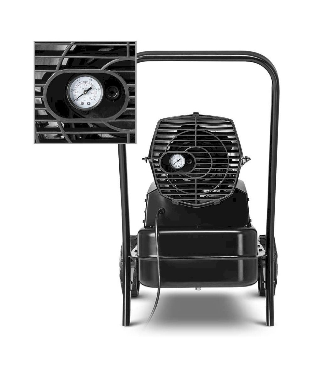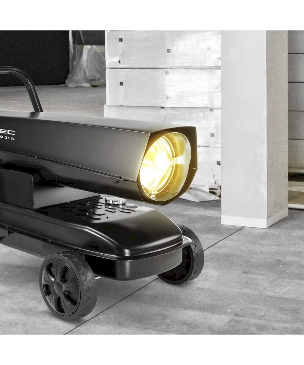 Dank seiner praktischen Fahrwagenkonstruktion mit integriertem 38-Liter-Kraftstofftank ist der markant schwarze Direkt-Ölheizer jederzeit auf einen schnellen Standortwechsel vorbereitet. Zur einfachen Temperatursteuerung verfügt das Ölheizgebläse IDX 31 D über ein stufenlos regelbares Thermostat mit digitaler Echtwertanzeige. Eine zweite Digitalanzeige informiert über die jeweils aktuelle Raumtemperatur. Die leicht ablesbare Füllstandsanzeige gibt zuverlässig Auskunft über die verbleibende Brennstoffmenge. Dank elektronischer Flammensicherung und integriertem Überhitzungsschutz ist stets für höchste Betriebssicherheit gesorgt.