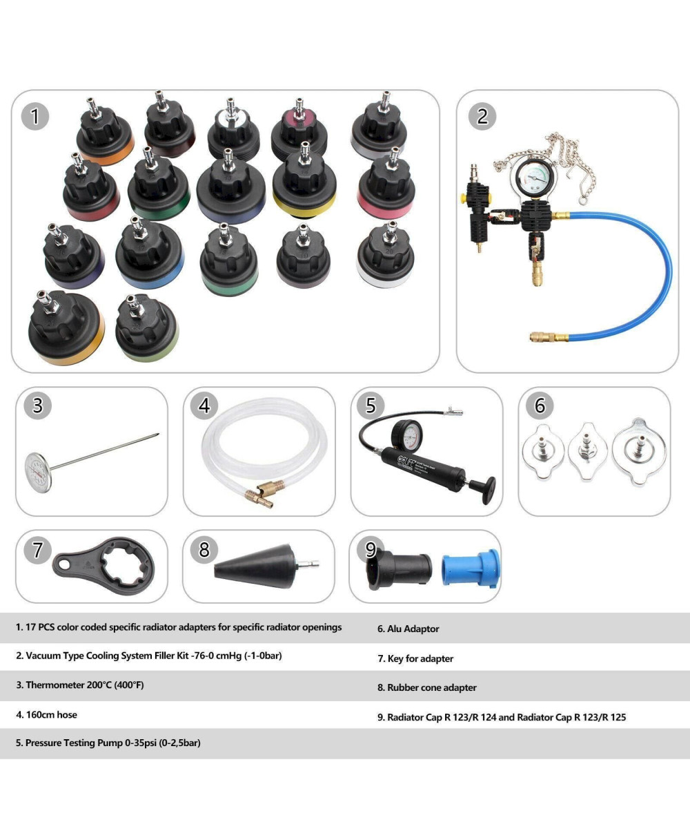 Der Kühlsystemtester von CCLIFE ist eine ideale Satzzusammenstellung zur Druckprüfung des Kühlsystems sowie der Verschlusskappen. Unser Produkt realisiert schnelles Auffinden von Undichtigkeiten im Kühlsystem, z.B. Zylinderkopfdichtung, Kühleraggregaten, Wasserpumpen, Schläuchen etc.
