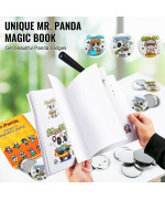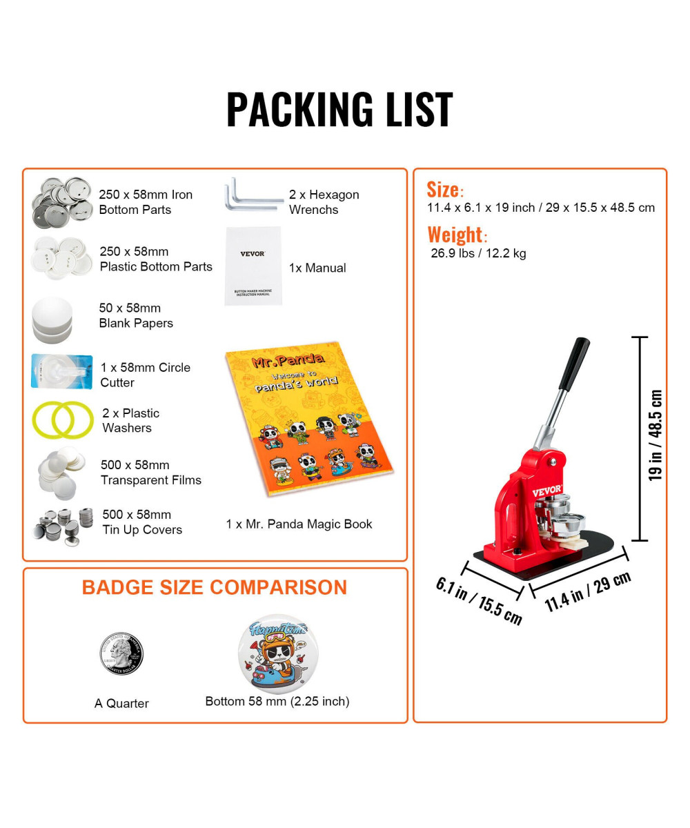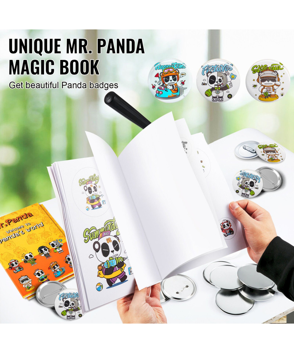 1 x Stecknadelmaschine, 1 x 58-mm-Knopfformen, 1 x Kreispapierschneider, 250 x 58-mm-Eisenunterteile, 250 x 58-mm-Kunststoffunterteile, 500 x 58-mm-Dosenabdeckungen, 50 x 58-mm-Blankopapiere, 500 x 58-mm-Klarsichtfolien, 2 x Sechskantschlüssel, 2 x Unterlegscheiben, 1 x Anleitung. Zusätzlich erhalten Sie ein einzigartiges „Mr. Panda Zauberbuch“ mit vielen schönen Panda-Motiven.