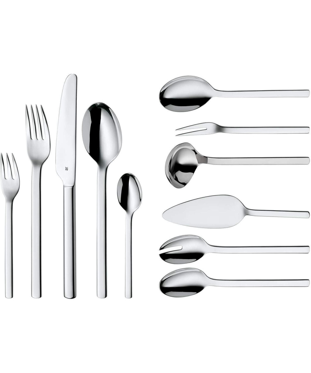 Ganz klar: Dieses Set ist für die große Tafel gedacht. Es bietet Besteck für zwölf Personen – Menuegabel, -messer und -löffel sowie Kuchengabel und Kaffeelöffel – und darüber hinaus nützliches Zubehör. Dazu gehören ein zweiteiliges Salatbesteck, ein Servierlöffel und eine Serviergabel, ein Portionsschöpfer sowie ein Tortenheber. Natürlich ist das Set in verschiedenen WMF Designs erhältlich, kann mit passenden Ergänzungsteilen erweitert werden und wird Ihnen dank seiner Hochwertigkeit ein gleichermaßen schöner wie dauerhafter Begleiter sein.