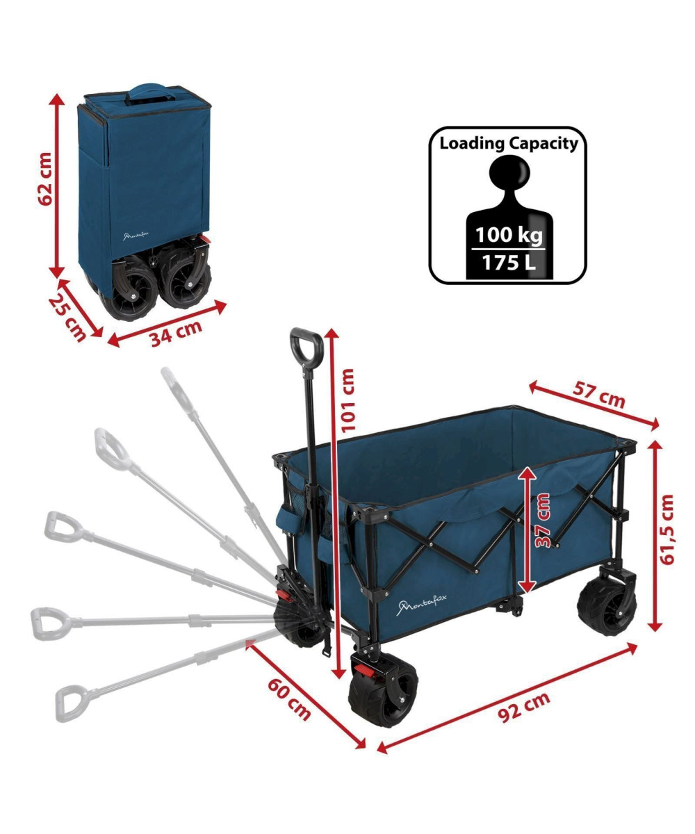 Mit unserem zusammenklappbaren Transportwagen kann man problemlos Gegenstände transportieren. Ob Gartengeräte, Campingutensilien, Kinderspielsachen oder Lebensmittel, er wird Sie in vielen Lebenslagen unterstützen und vom schweren Schleppen befreien.