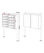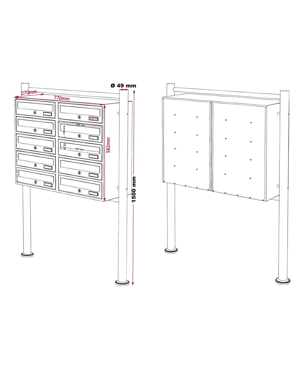 | Dimensionen: | Fach: 360 x 270 x 100mm Briefschlitz: 325 x 30mm Briefkasten: 582 x 770 x 270mm Standhalterung: 1500 x Ø 49mm / 85mm |