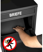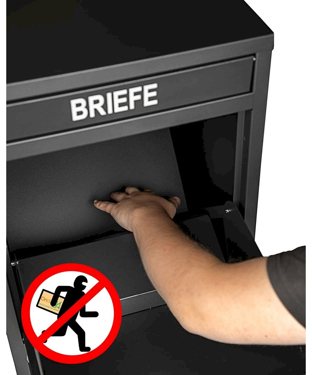 S ie möchten nicht mehr länger jedes Paket beim Nachbarn oder schlimmer am nächsten Werktag im Kilometer weit entfernten Paketshop abholen? Sie haben es satt, dass Ihre Pakete immer aus dem Hausflur "verschwinden" und an den unmöglichsten Orten abgelegt werden? Dann ist die 1-türige Postbox genau richtig für Sie! Der Paketshop vor der eigenen Haustür, einfach und sicher. Pakete, Päkchen, Warensendungen und Briefe können vom Postboten einfach und kontaktlos in die Klappe eingeworfen werden und fallen beim Schließen in den Paketsafe. Dank einem Klappensystem sind die Briefe und Päckchen ab sofort von der Klappe aus nicht mehr zugänglich. Wenn Sie nach Hause kommen können Sie dann den Paketsafe mit dem Schlüssel öffnen und Ihre Briefe und Pakete entnehmen, die dort vor Regen und Witterung geschützt sofort für Sie bereit liegen. Vorbei die Zeit in der der Lieferant versucht hat, mit aller Kraft Sendungen in Ihren Briefkasten zu quetschen. Jetzt landen Ihre Pakete und Warensendungen sicher und unversehrt im eigenen Paketsafe. Damit die Packstücke auch sicher und vor allem leise landen, befindet sich auf dem Boden des Paketsafes eine dicke Schaumstoffmatte, die den Aufprall dämpft. So wird niemand durch die Geräusche gestört und Ihre Pakete werden vor Beschädigungen geschützt. Damit Ihre Paketbox nicht weggetragen werden kann, befinden sich vier starke Bodenanker im Lieferumfang mit der Sie Ihre Postbox bombenfest im Boden verankern können. Mitgeliefert werden zusätzlich zwei Schlüssel, damit zwei Personen im Haushalt Zugriff haben. Die gesamte Paketbox ist aus Metall gefertigt und einbrennlackiert und damit sicher vor äußerem Zugriff. Die Einwurfbreite beträgt 34cm, ein Einwurfhöhe bis zu 30cm, je nach Höhe sind auch 50cm lange Pakete kein Problem - damit passen die gängigsten Paketgrößen in Ihre Paketbox.
