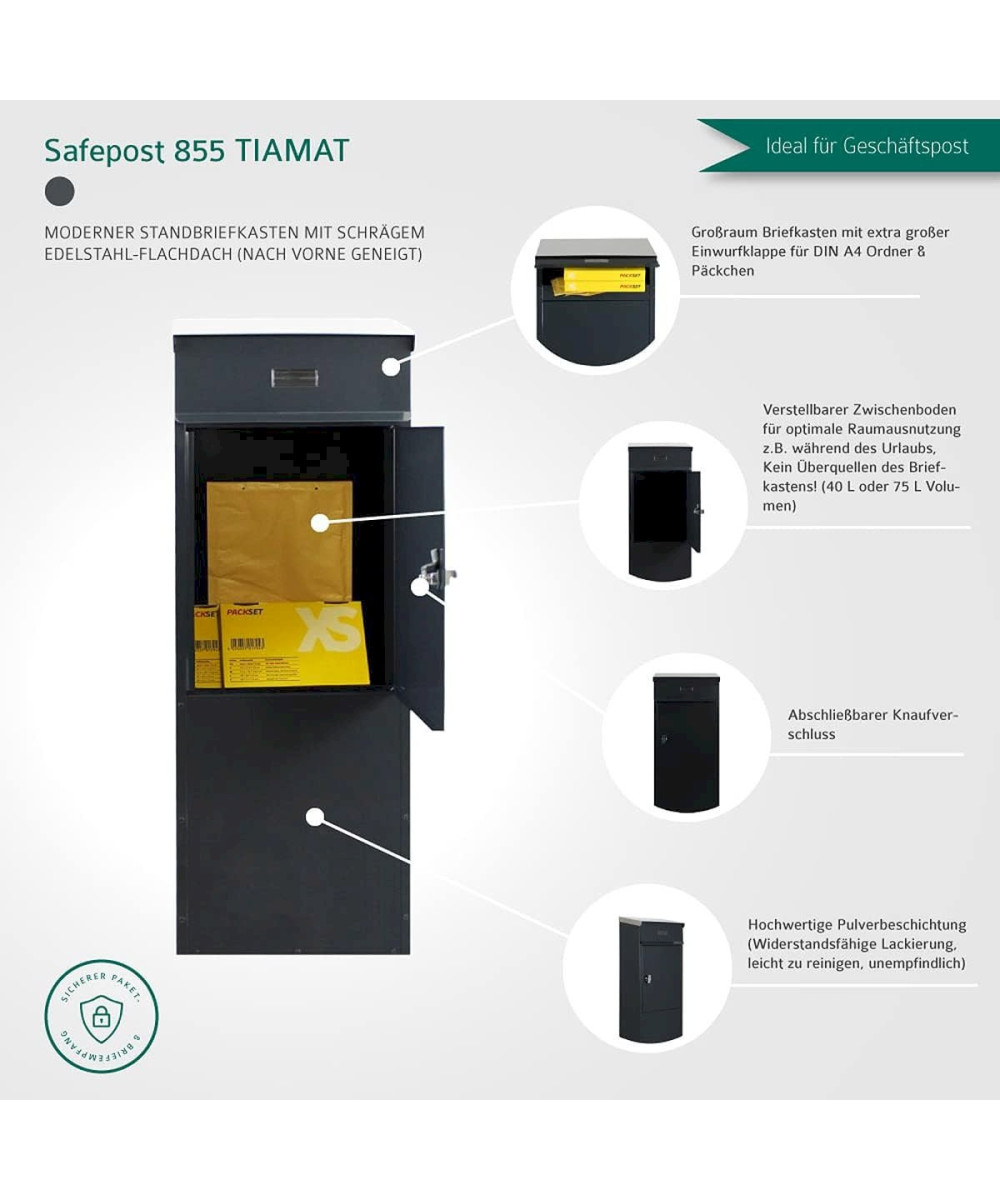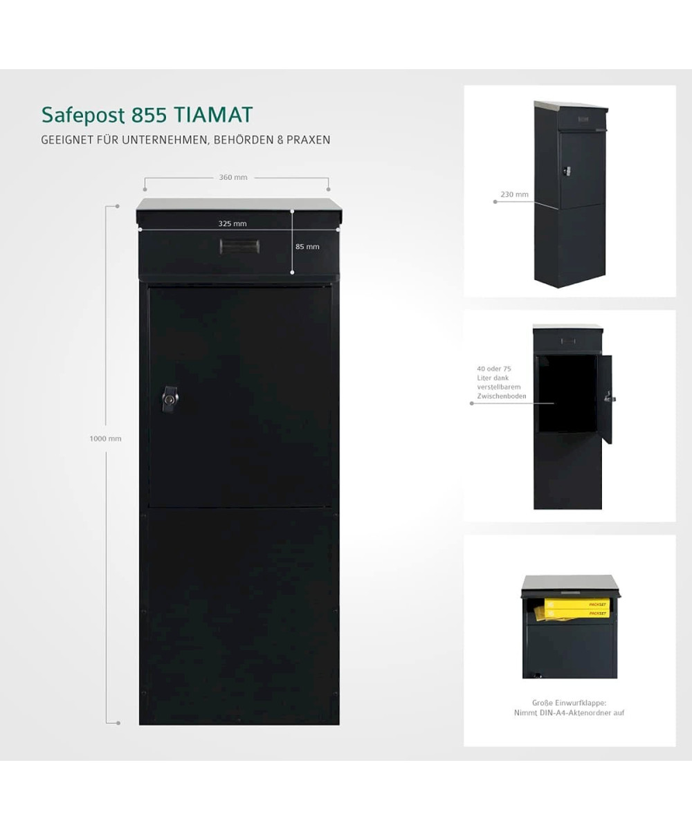 Standbriefkasten mit großem Volumen und extra großer Einwurfklappe: hier passen auch Ordner rein! Der Safepost 855 TIAMAT Sicherheitsbriefkasten ist besonders für Gewerbebetriebe, Steuerberater, Kanzleien, Labore, Büros, etc. geeignet.