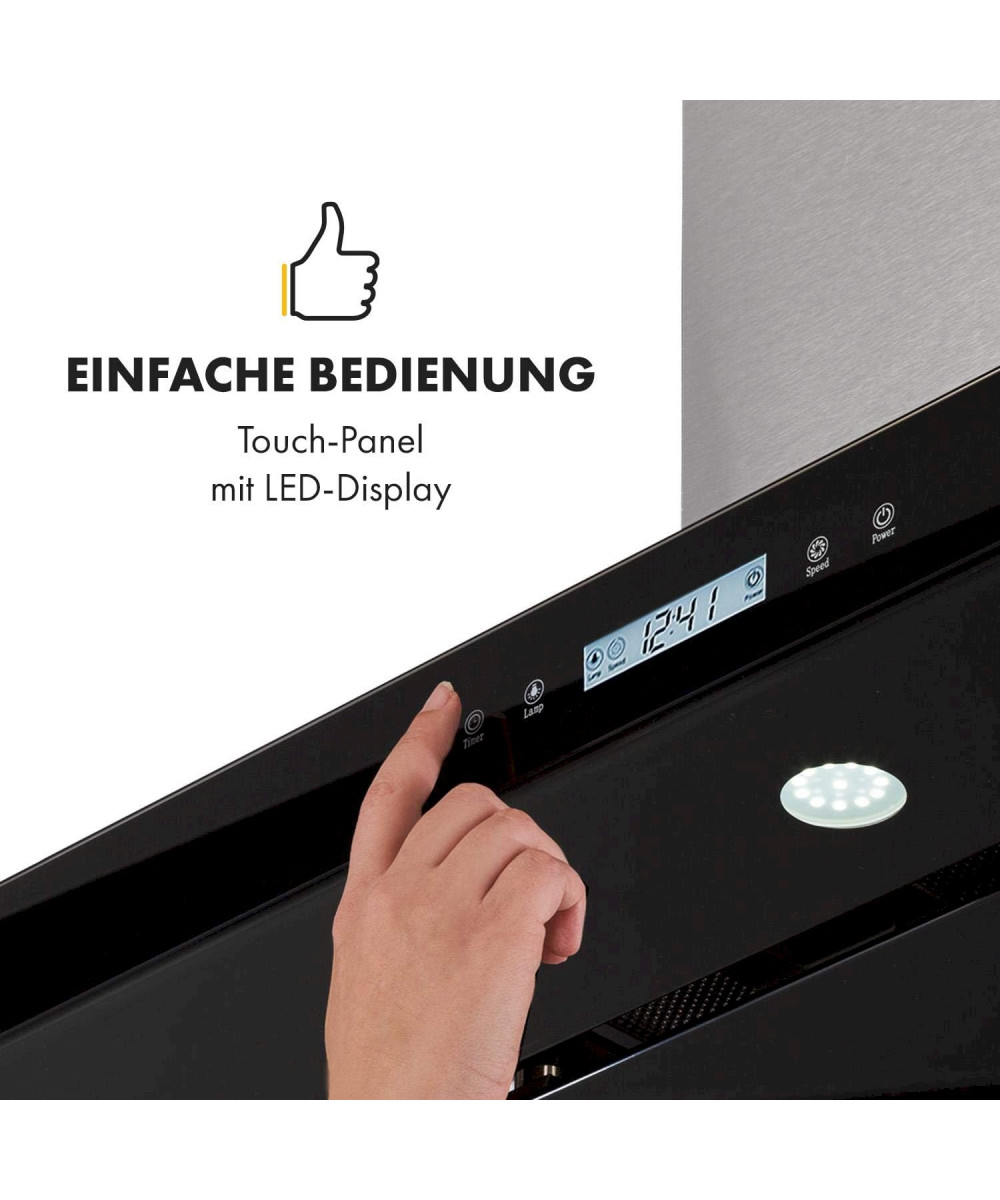 Die Klarstein Valeria Dunstabzugshaube vereint moderne Technik mit stilvoller Eleganz: Mit 230 Watt in drei Leistungsstufen - niedrig, mittel und hoch - rückt sie Küchendunst zu Leibe und bewältigt bis zu 650 m³ Abluft in einer Stunde. Gesteuert wird sie vollkommen unkompliziert über ein Touch-Panel an der Frontseite. Eine zuschaltbare Kochflächen-Beleuchtung aus 6 hocheffizienten LED-Lampen setzt hilfreich Töpfe und Pfannen ins rechte Licht und gewährt passionierten Topfguckern erhellende Einblicke. Ein einstellbarer Timer kann in Minutenschritten von 5 bis 60 Minuten zur automatischen Abschaltung der Haube genutzt werden und sorgt dafür, dass die Haubeauch das letzte Restchen an Dampf beseitigt, wenn Sie schon mit der Familie beim Essen sitzen. Die automatische Temperaturkontrolle sorgt zusätzlich dafür, dass die Haube sich automatisch ein- und ausschaltet, sobald tatsächlich Dampf am Herd erzeugt wird.