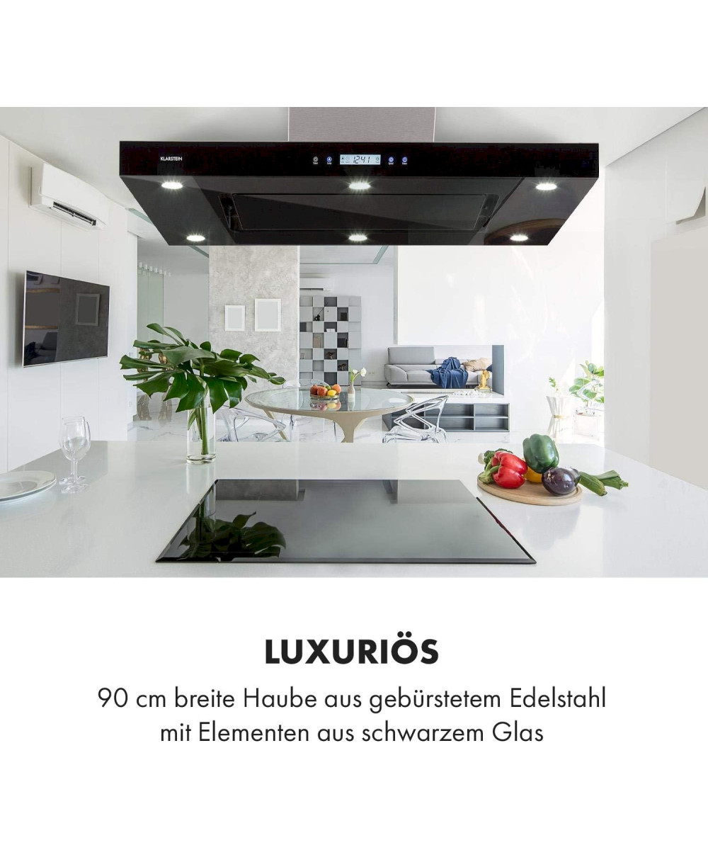 Mit ihrem eleganten Design versprüht die Klarstein Valeria Inselhaube einen frischen Glanz vor allem in modern eingerichteten Küchen, denn als Inselhaube wird sie direkt von der Decke über dem Kochfeld abgehängt. Dabei vertraut sie ganz auf die alterslose Eleganz von gebürstetem Edelstahl in der Kombination mit schwarzen Glaselementen. Praktisch ist auch ihre flache Oberfläche mit der sie perfekt zum Gewürzregal wird.