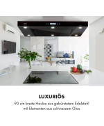 Schönste Effizienz: Die Klarstein Valeria Inselabzugshaube befreit Küchen von Dunst und Dampf und bereichert sie um einen edlen Blickfang in einem glänzenden Kleid aus Edelstahl mit luxuriösen, schwarzen Glaselementen an Front- und Rück- sowie der Haubenunterseite.