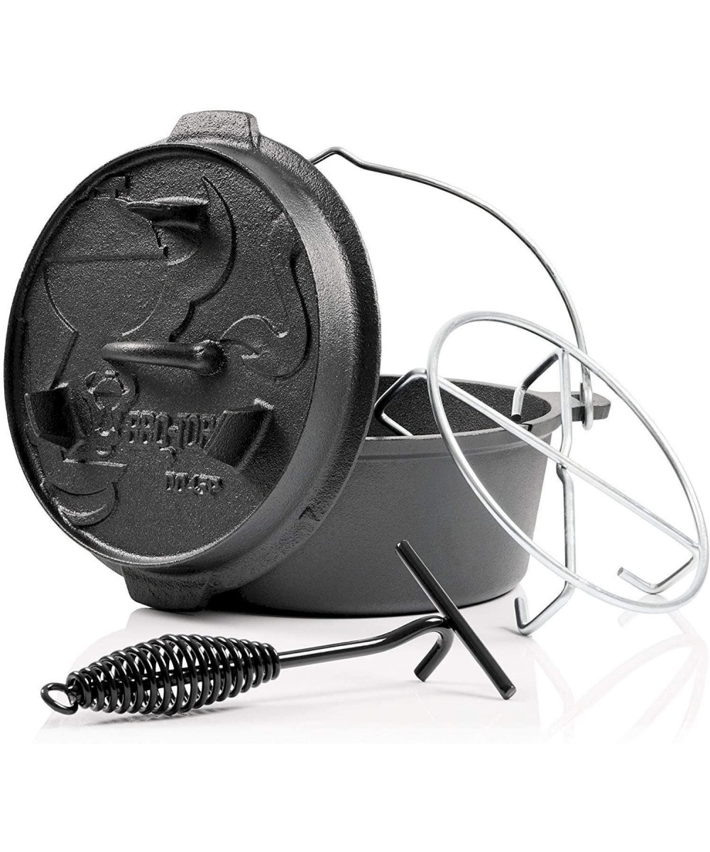 Der Dutch Oven ist ein schwerer, traditioneller, gusseiserner Topf und ein exakt passender Deckel mit dem man überall kochen, braten, schmoren, frittieren, dünsten und backen kann. Der Dutch Oven reguliert dank seiner hohen Masse (Gusseisen) ungleichmäßige Hitze und ermöglicht so ein gleichmäßiges Garen. Einfach glühende Kohlen, Glut oder Grillbriketts auf den Deckel und unter den Topf geben und das Dutch Oven-Erlebnis kann losgehen. Der extra erhöhte Deckelrand und der Untersetzer bieten optimale Bedingungen für Kohle und Co.