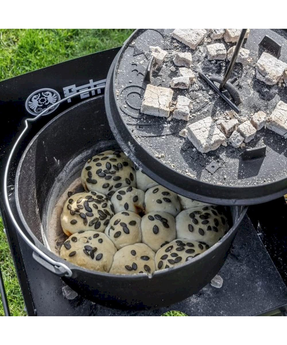 Die besondere Qualität der Feuertöpfe zeigt sich in den gleichmäßigen Wandstärken und den behandelten Kanten, die für eine optimale Hitzeverteilung und -speicherung sorgen. So garen deine Speisen gleichmäßig. Der Deckel kann zudem als Pfanne genutzt werden und verfügt über einen hohen Rand, damit Kohle oder Briketts nicht herunterfallen.