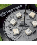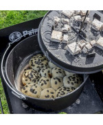 Der Deckel des Feuertopfs ist ein echtes Multitalent. Nutze ihn als Pfanne oder Grillplatte – die flache Form und stabilen Füße machen es möglich. Der erhöhte Rand hält Kohle und Briketts sicher an Ort und Stelle, ideal für Oberhitze!
