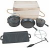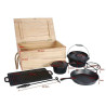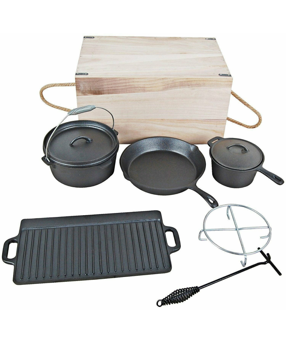 Dieses reichhaltige 7-teilige Set bietet außerdem eine gusseiserne Pfanne mit Ø30.5 x 5 cm (2,6 kg), einen gusseisernen Saucentopf mit Ø18,7 x 9.2 cm (3,1 kg), eine gusseiserne gerippte Grillplatte mit 50,5 x 23,5 cm (4,1 kg), eiserner Untersetzer/Aufständer für mehr Bodenfreiheit (5 cm) und eine dekorative Holztruhe zur Aufbewahrung (53,8x23,2x32 cm).
