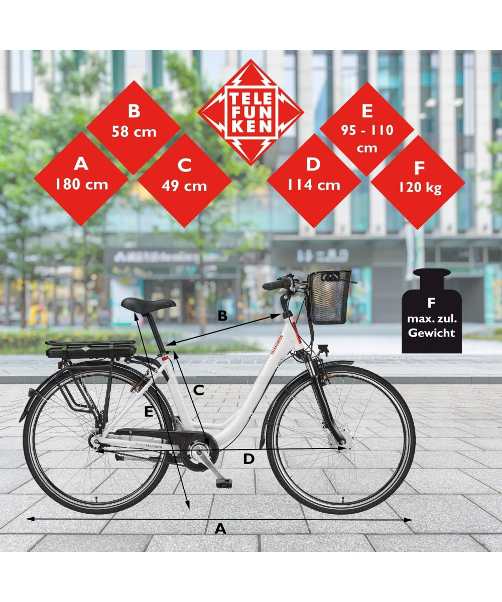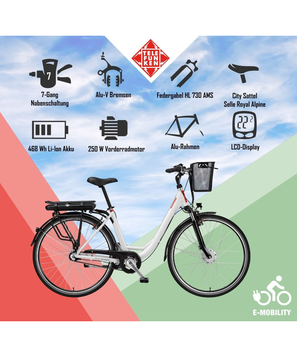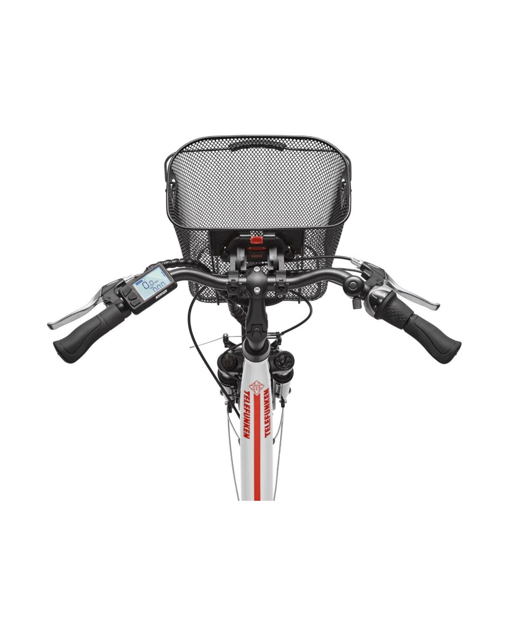 Das E-Bike von Telefunken ist gemacht für den Einsatz in der Stadt. Der starke 250 Watt/36 V Motor unterstützt dabei auch eine längere Tour oder hilft bei Anstiegen. Angetrieben wird der wartungsfreie Motor des City E-Bikes von einem 36 V/13 Ah Lithium-Ionen-Akku, der im Gepäckträger integriert ist.