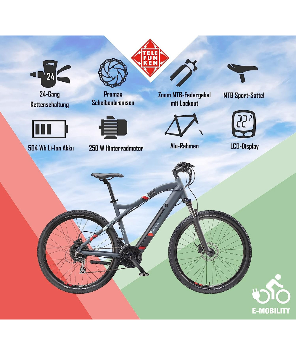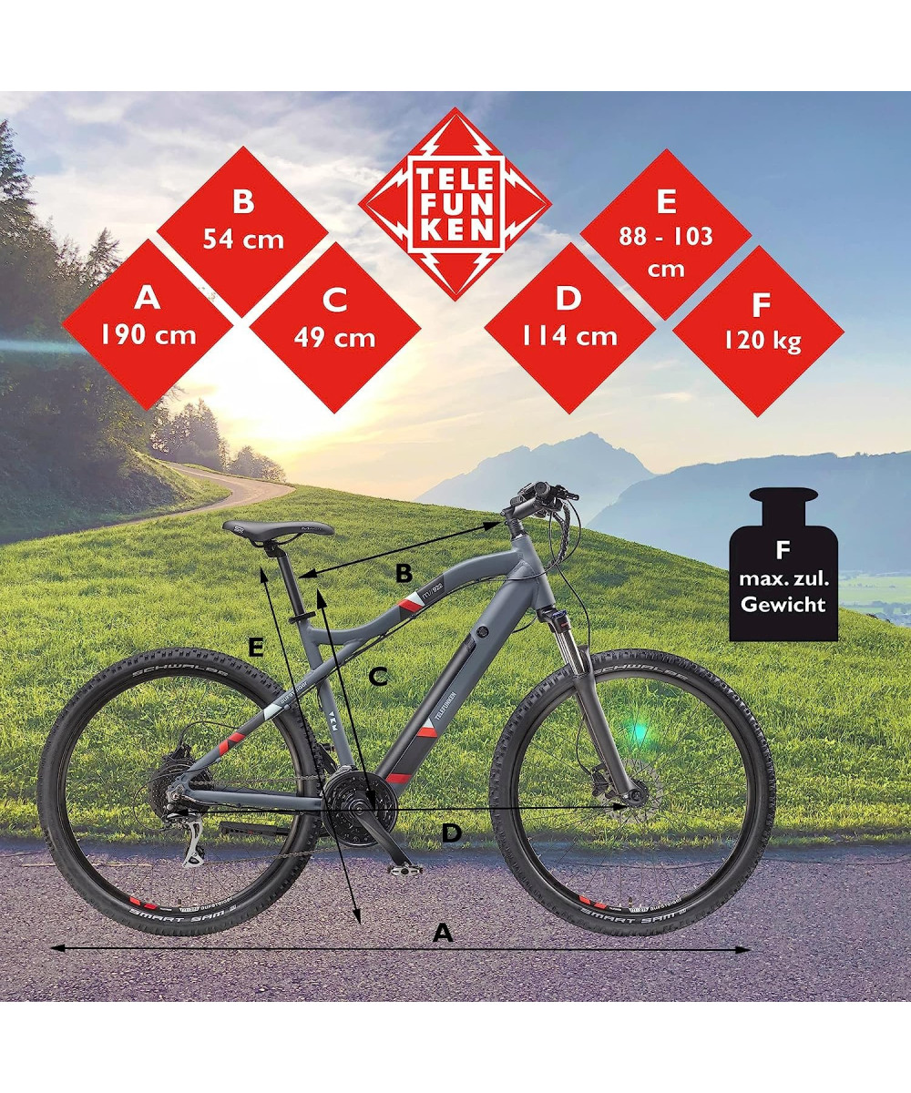 Auf dem mitgeliefertem LCD-Display werden Sie während der Fahrt mit allen wichtigen Informationen versorgt. Mit der 24-Gang Kettenschaltung von Shimano und der MTB Vollausstattung steht der nächsten Geländetour mit dem Telefunken E-Bike nichts mehr im Wege. Für Ihre Sicherheit sorgen mechanische Scheibenbremsen vorne und hinten.