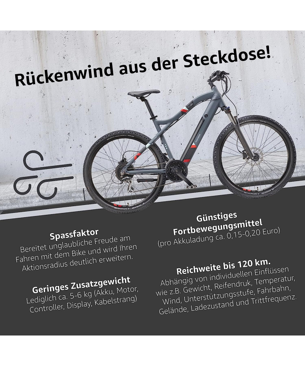 Das E-Bike MTB Aufsteiger M922 von Telefunken ermöglicht Ihnen einen perfekten Einstieg ins freie Gelände und unterstützt Sie dabei durch den eingebauten Motor mit 250 Watt und 50 Nm. Dieser wird vom integrierten Akku (36 V, 14 Ah) versorgt und ermöglicht Ihnen eine Reichweite von bis zu 100 Kilometern, je nach Belastung.