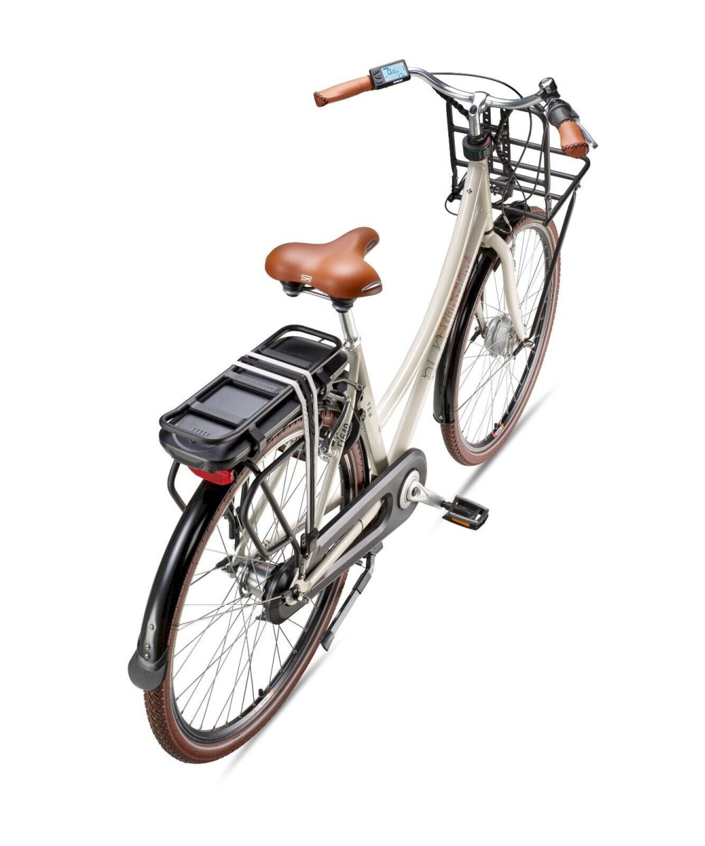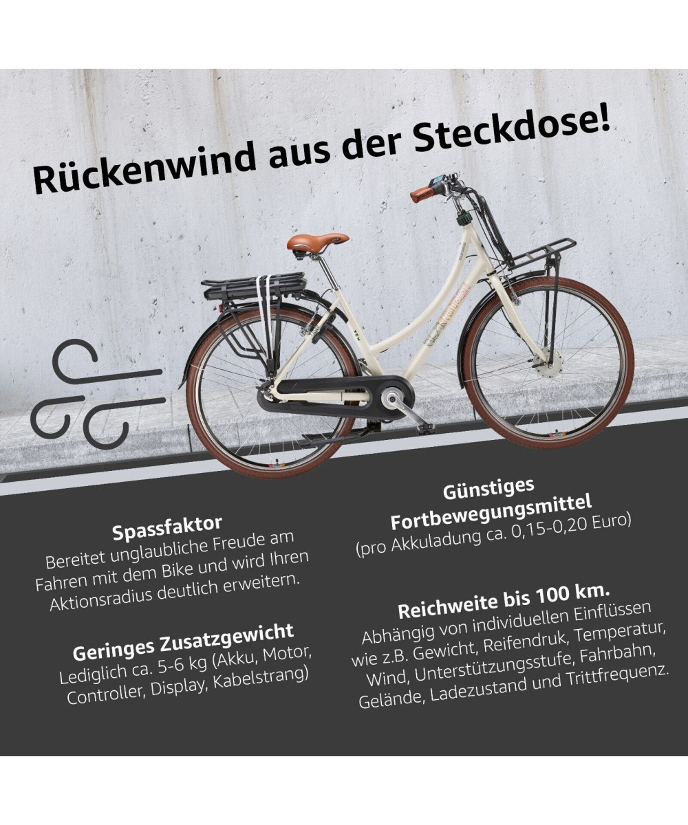 Das E-Bike bietet den komfortablen, tiefem Einstieg der typisch für Damen-Räder ist, jedoch ausdrücklich für jeden geeignet (Unisex). Der Aluminium-Rahmen sorgt für ein niedriges Gewicht (24 kg), sodass bei Bedarf auch das Tragen gut möglich ist.