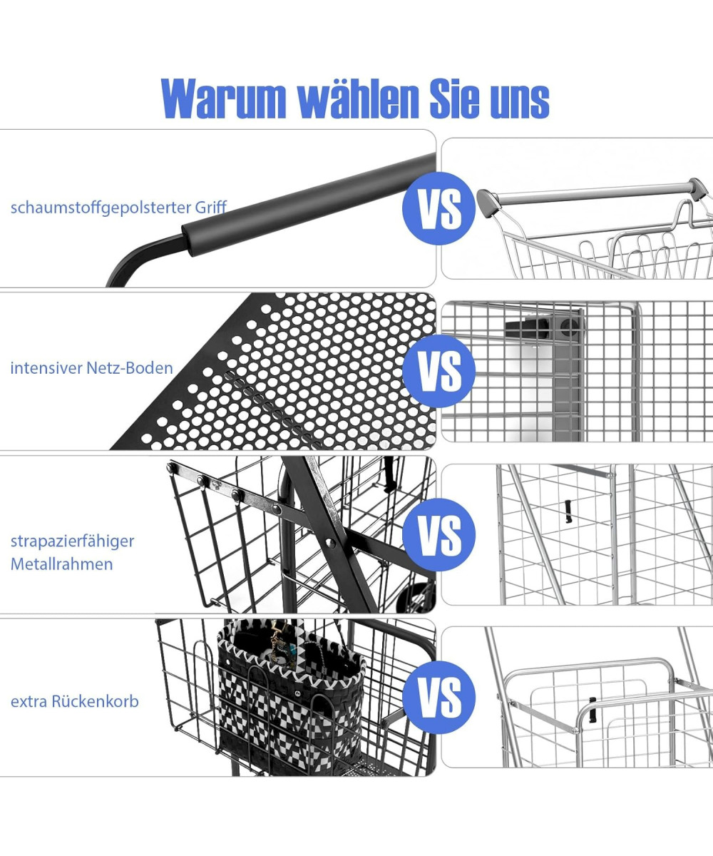 - Mehrere nützliche Details: Der Einkaufswagen verfügt außerdem über einen mit Schaumstoff gepolsterten Griff zum bequemen Greifen und einen zusätzlichen Korb auf der Rückseite für die Aufbewahrung privater Gegenstände. Das tragbare Design und die große Kapazität rechtfertigen seine Nutzung zu verschiedenen Zwecken, wie im Supermarkt, als Wäschewagen und so weiter.