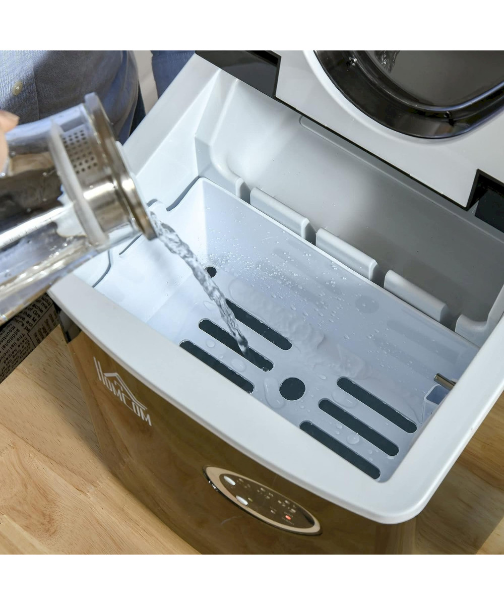Sind Sie auf der Suche nach einer Eiswürfelmaschine, die Sie das ganze Jahr über mit Eiswürfeln versorgen kann? Dieser Eiswürfelbereiter von HOMCOM kann Ihren Bedürfnissen hervorragend begegnen: Sie kann insgesamt 15 kg kugelförmige Eiswürfel binnen 24 Stunden produzieren und verfügt über ein Sichtfenster, um den Herstellungsprozess zu überwachen. Es stehen Ihnen 3 unterschiedliche Eiswürfelgrößen zur Auswahl und 2 praktische Anzeigen informieren Sie immer über die notwendigen Bedienschritte.