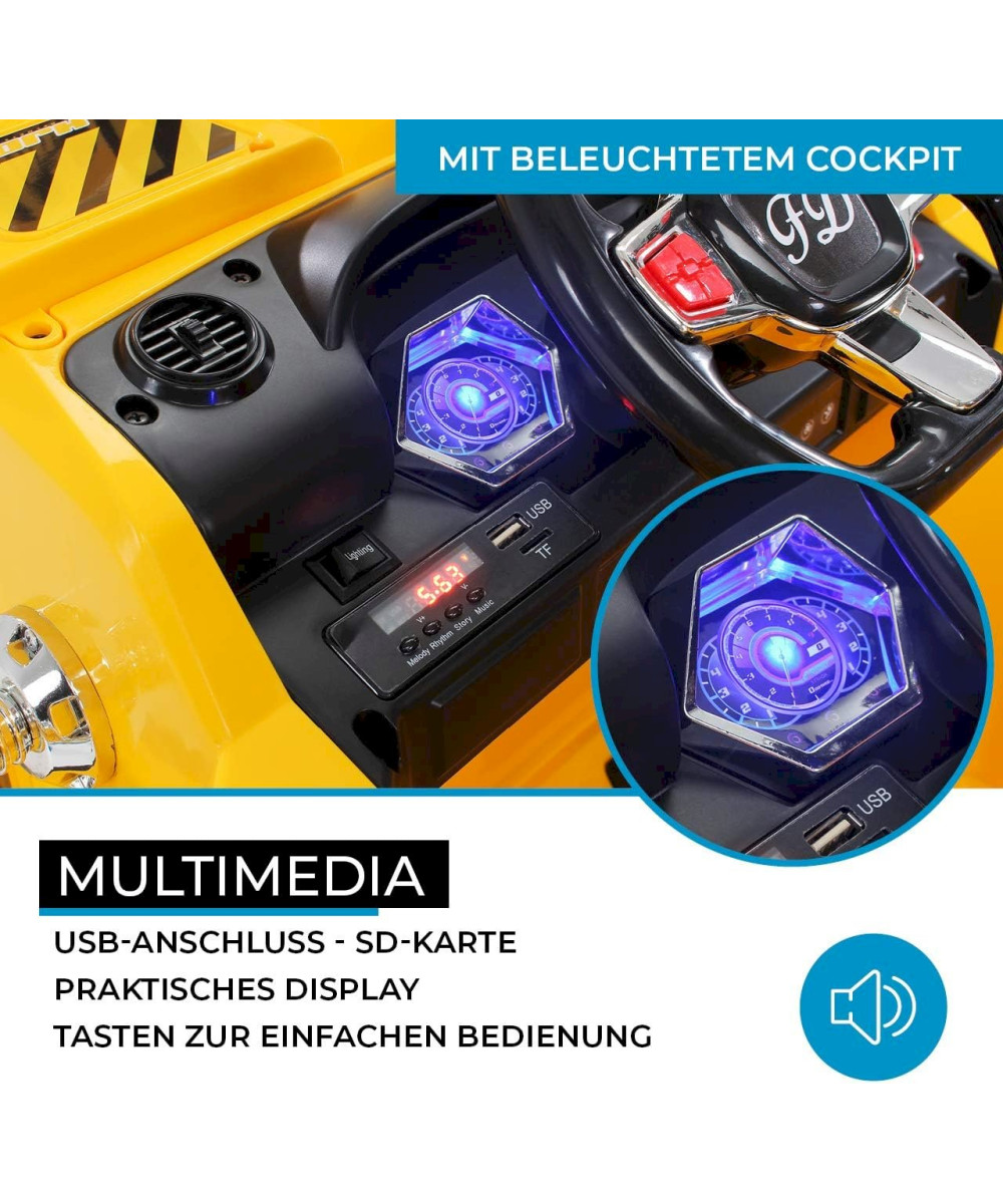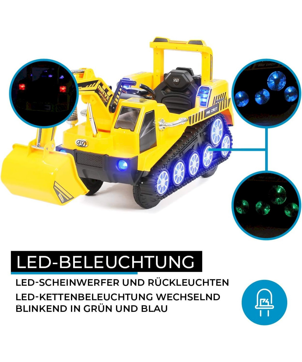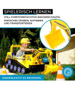 Authentischer Fahrspaß garantiert! Der gelbe Elektro Kinderbagger kommt dank liebevoller Details dem großen Vorbild sehr nahe. Dieses Kinder Elektrofahrzeug ist mit einer voll funktionstüchtigen Schaufel ausgestattet, mit der Ihr kleiner Bauarbeiter ordentlich buddeln kann. Ein Soundmodul sorgt für passende Atmosphäre. Kreativität fördern – einfach loslegen!