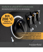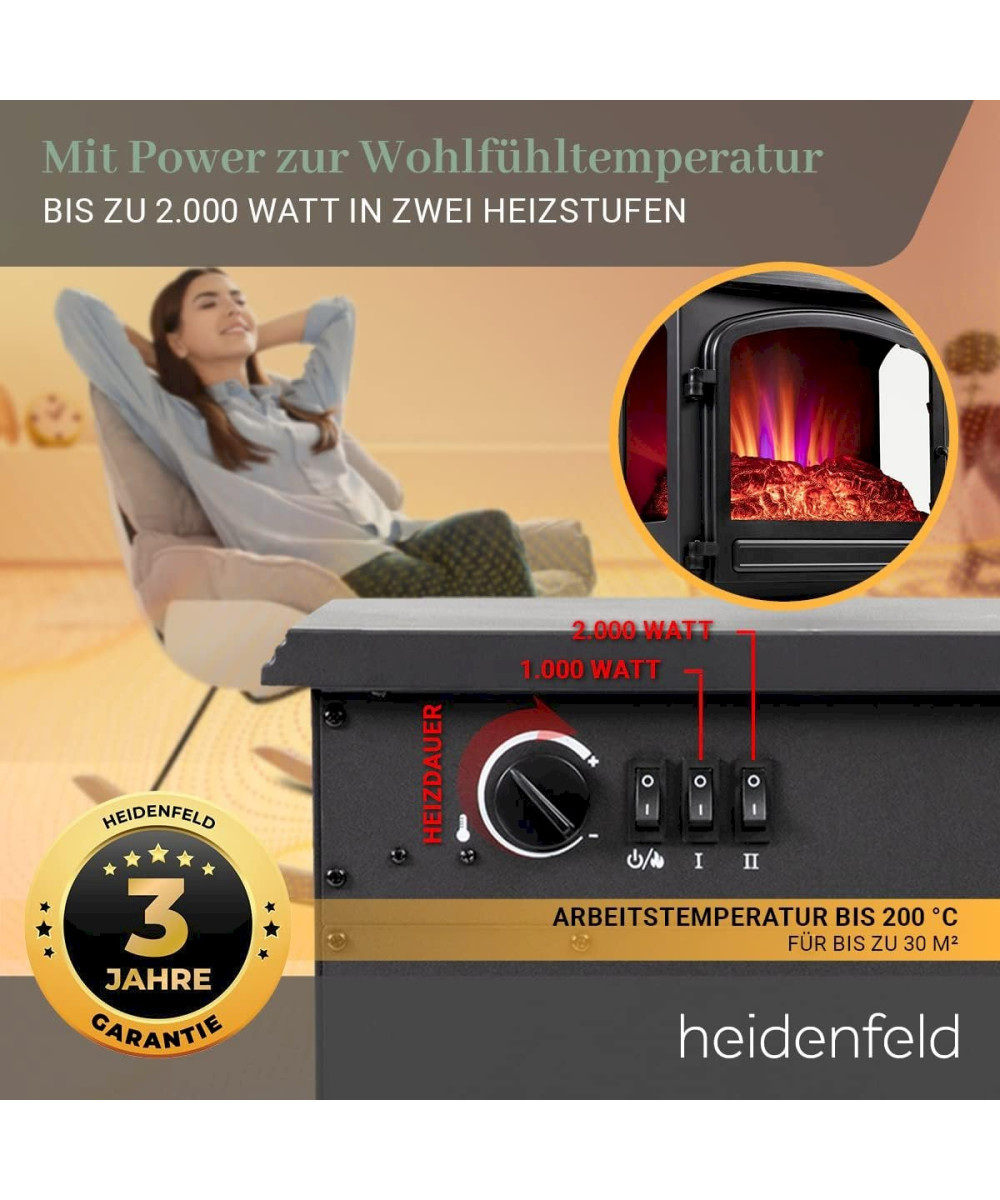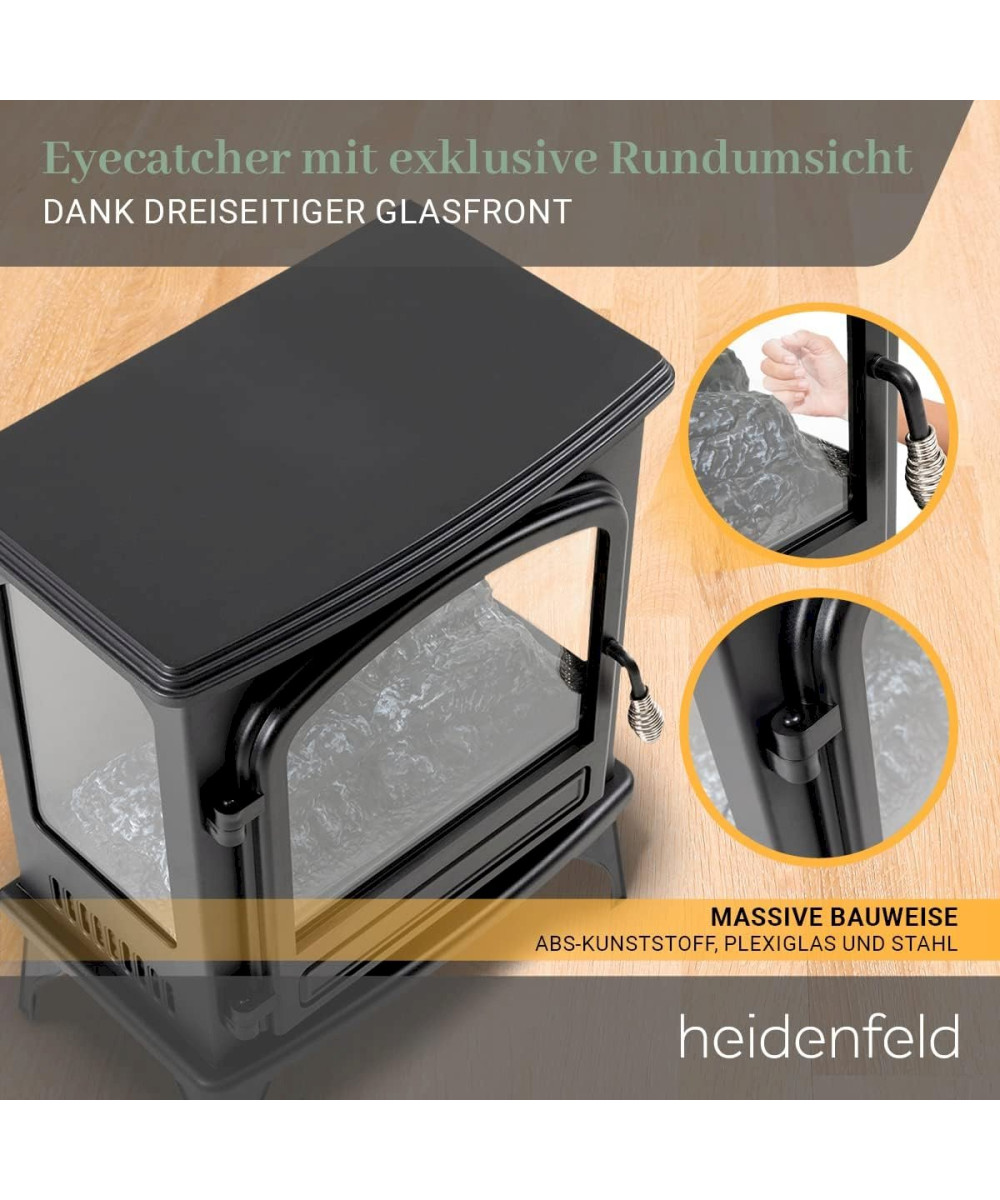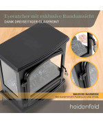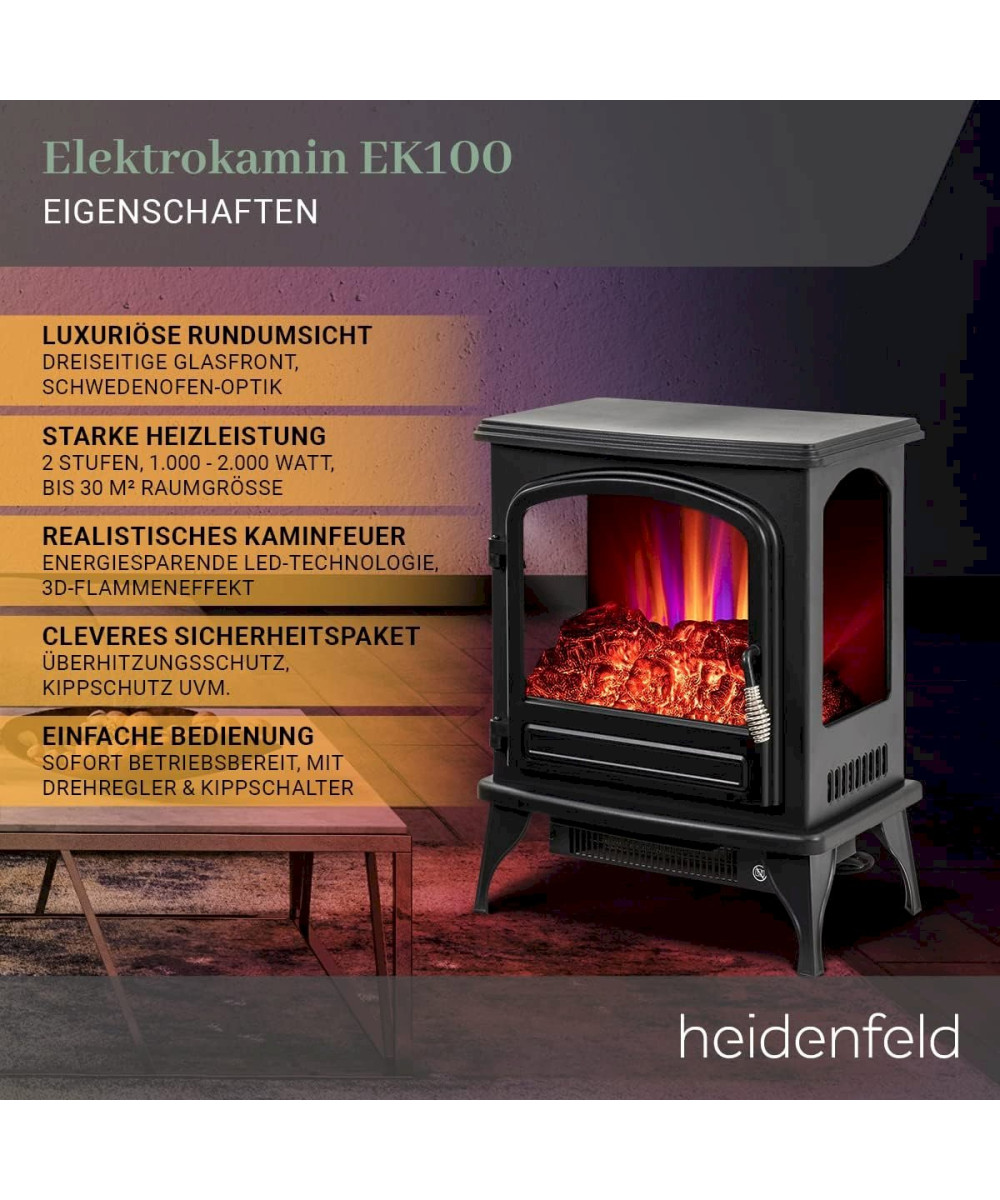 Züngelnde Flammen erhellen den Raum, kuschlige Wärme hüllt uns sein: Setzen Sie diese Wunschvorstellung in die Tat um! Ein Elektrokamin bringt diese Wohlfühl-Atmosphäre ohne Baumaßnahmen oder aufwendige Installation in Ihr Zuhause. Der Heidenfeld Elektrokamin EK100 ist einer der Schönsten seiner Art. Als Standkamin konzipiert, erinnert er an einen modernen Schwedenofen. Durch seine dreiseitige Glasfront hebt er sich von anderen Modellen ab. Damit genießen Sie einen ungestörten Blick auf das realistische Kaminfeuer. Durch die 3D-Flammeneffekt und die Holzkohle-Optik lässt es sich kaum vom Original unterscheiden. Dank der Heizleistung von bis zu 2.000 Watt runden angenehme Temperaturen das Gesamtpaket ab. Und das alles bei einem beeindruckend geringen Energieverbrauch!