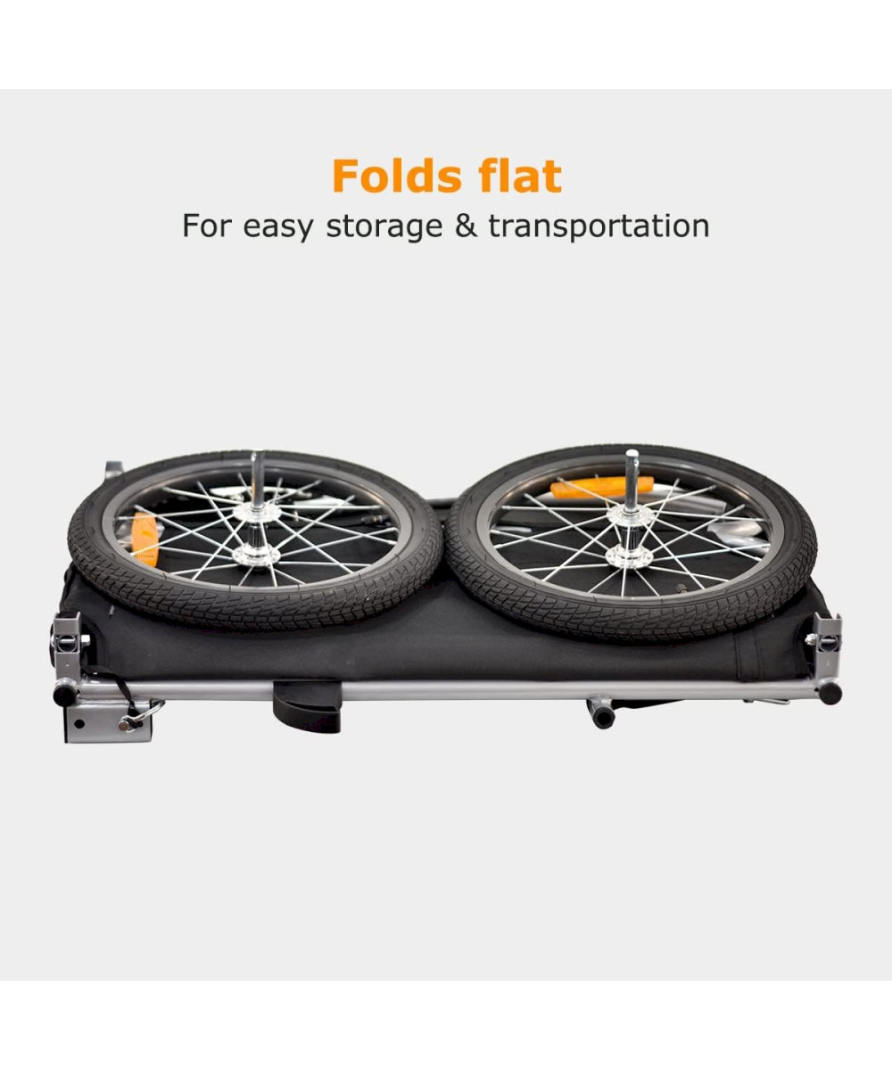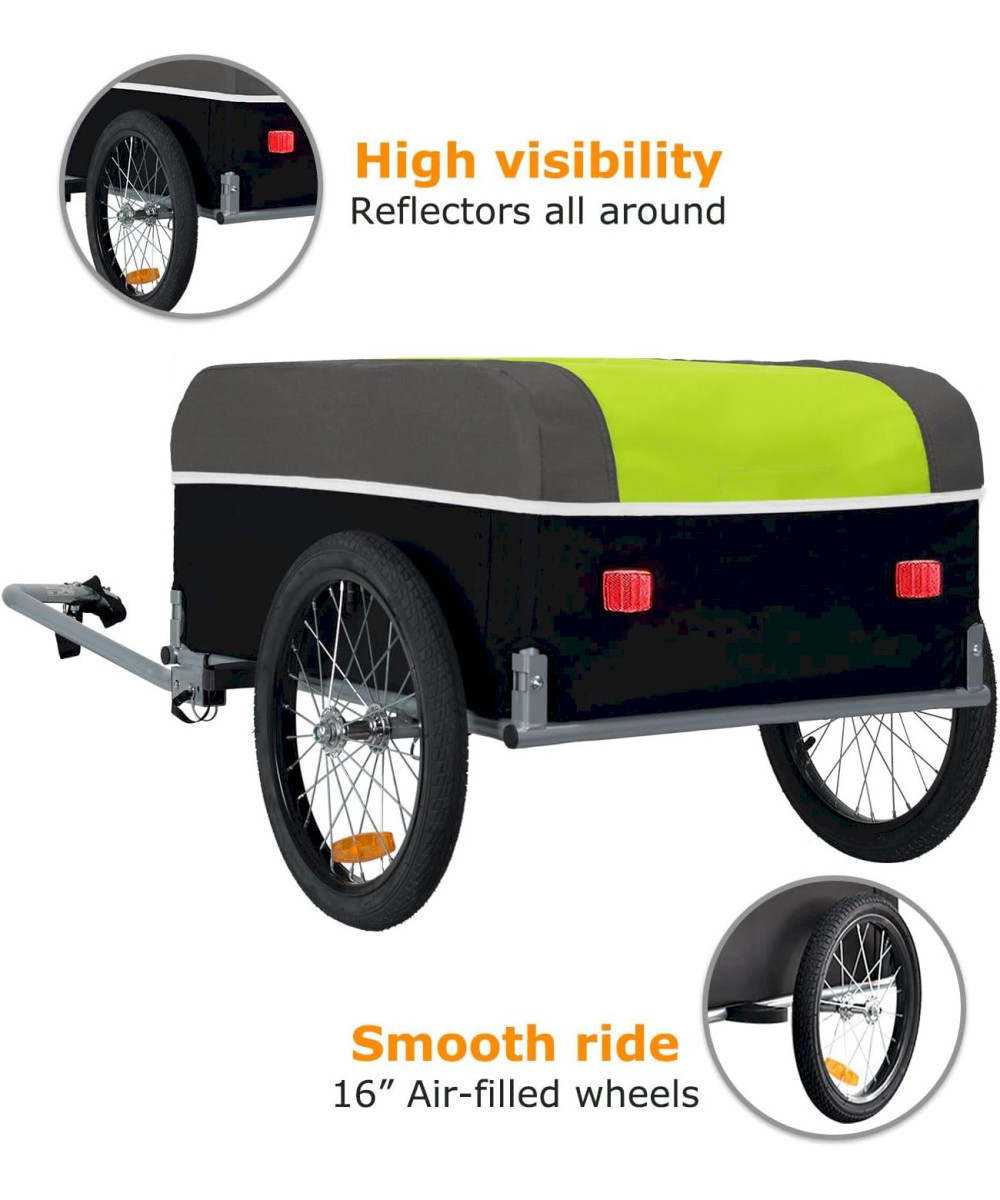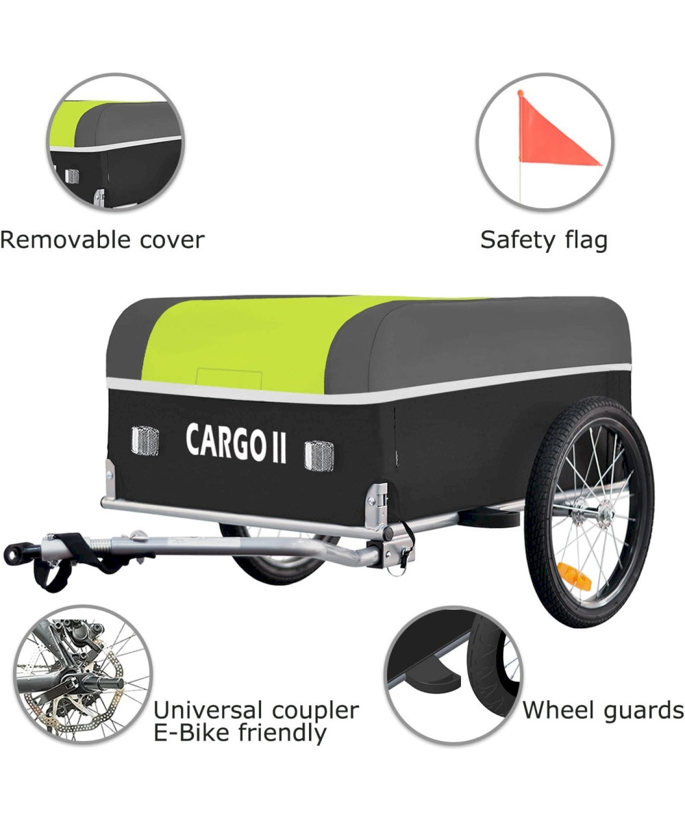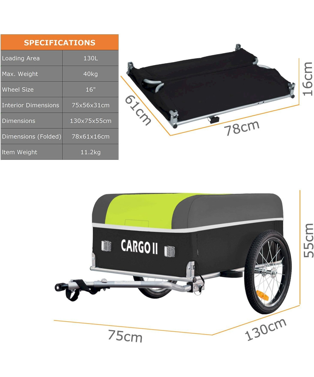 Dieser Lastenanhänger lässt sich leicht an den meisten Fahrrädern befestigen und hilft beim Transport von Ausrüstung, Spielzeug, Lebensmitteln und anderen Gegenständen für Freizeit und Beruf. Der Anhänger besteht aus einem stabilen Stahlrohrrahmen, ist pulverbeschichtet und verfügt über einen sehr großen Laderaum von 130 Liter.