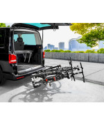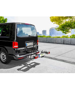 Der EUFAB Fahrradträger PROBC2+ trägt bis zu 60 Kilogramm Gewicht und nimmt es auch mit E-Bikes auf. Achte darauf, vor dem Transport die empfindlichen Akkus aus den Rädern herauszunehmen. - Praktische Abklappfunktion