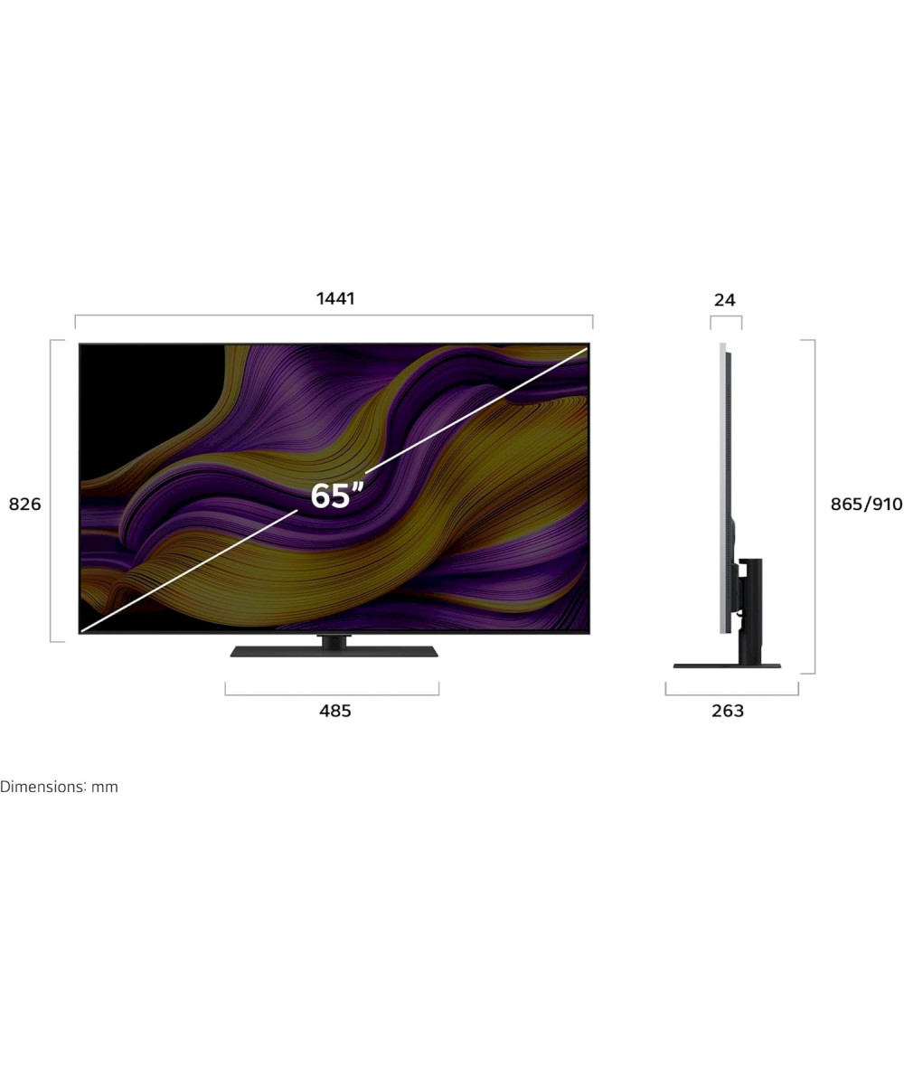 - Abmessungen TV mit Standfuß (BxHxT): 1.441 x 865/910 x 263