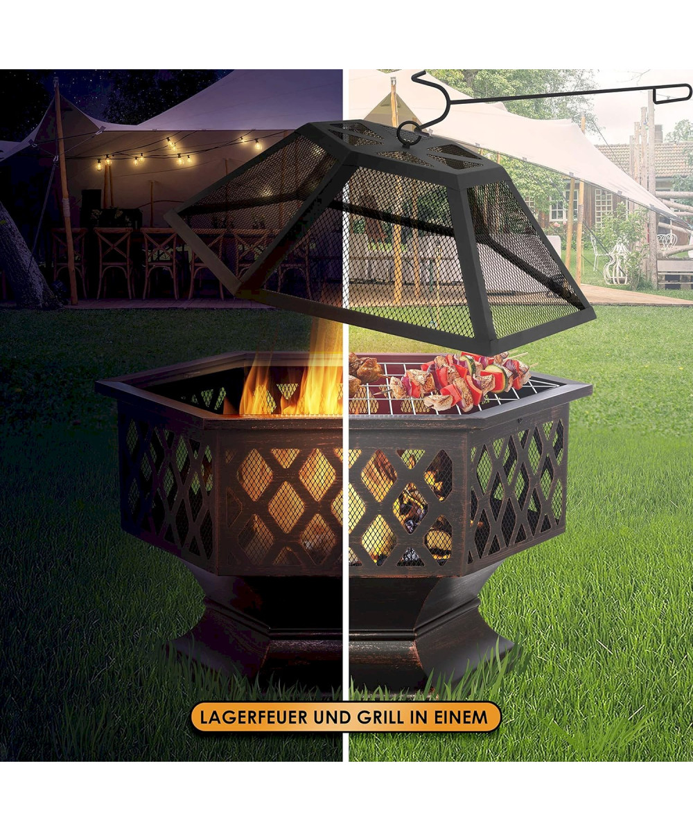 Der Multifunktionsofen besteht aus strapazierfähigem, stabilem Eisen mit schwarzer Beschichtung, und bietet dadurch Robustheit und Langlebigkeit für einen langjährigen Einsatz. Durch die großen Öffnungen im Rahmen des Grills und dem sechseckigen Schutzgitterschirm hat man eine ideale Luftzufuhr, die Luft kann sehr gut zirkulieren und das Feuer gelingt einfach immer!