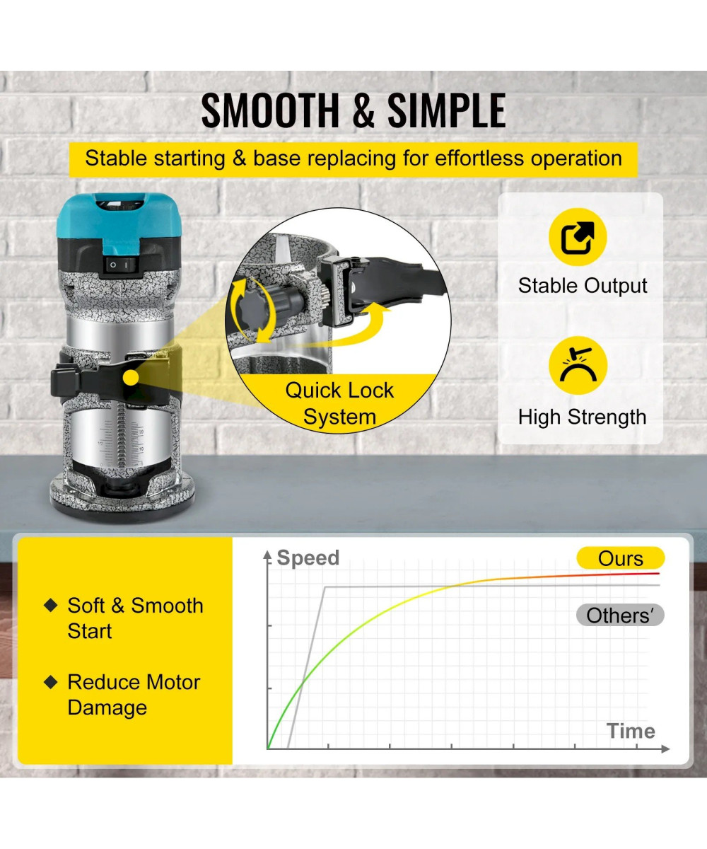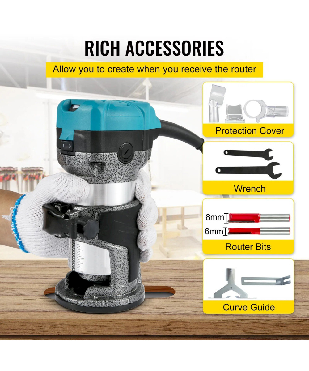 Dieses Fräswerkzeug ist vielseitig einsetzbar und kann für die Bearbeitung von Holz, Kantenformen, Holzschnitzen usw. eingesetzt werden. Erfüllt sowohl die Anforderungen im Haushalt als auch in der Industrie. Mit dem Tiefeneinstellungssystem, der variablen Geschwindigkeitssteuerung und dem kompakten Zubehörset können Sie direkt nach Erhalt des Pakets die Maschine aufstellen und mit der Arbeit beginnen.