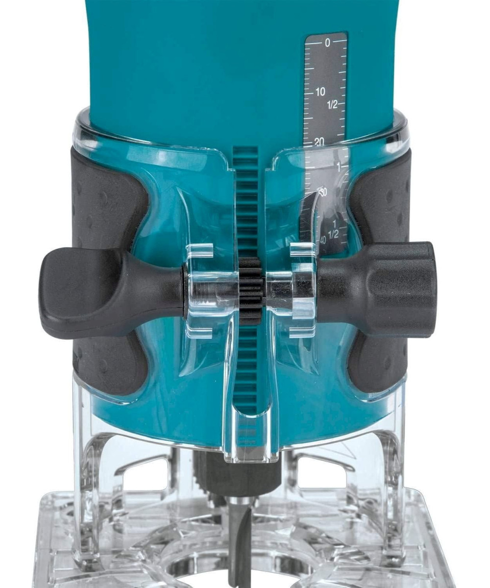 - Stufenlose, präzise Frästiefeneinstellung durch Zahnstangenmechanismus