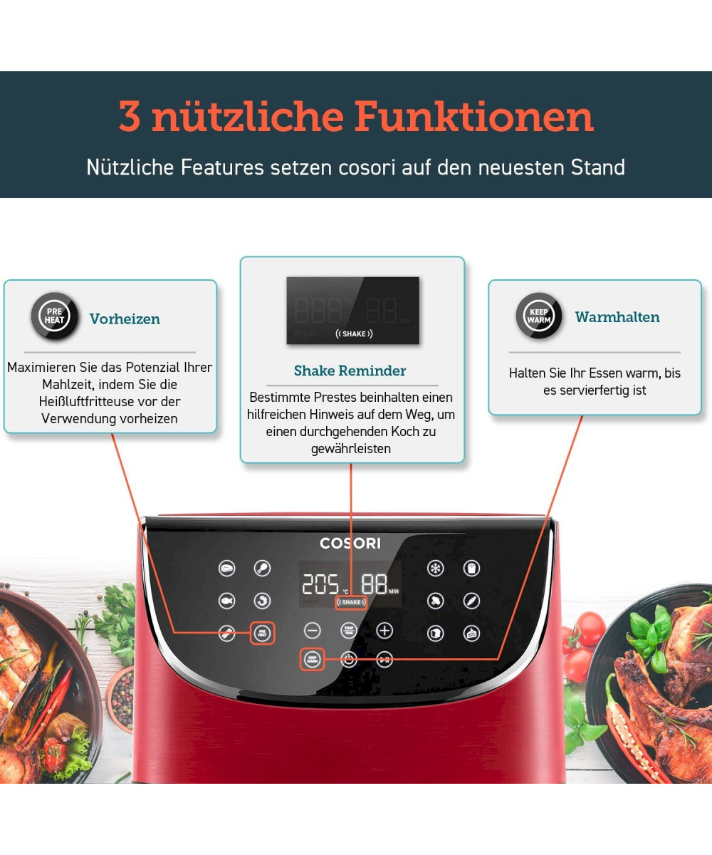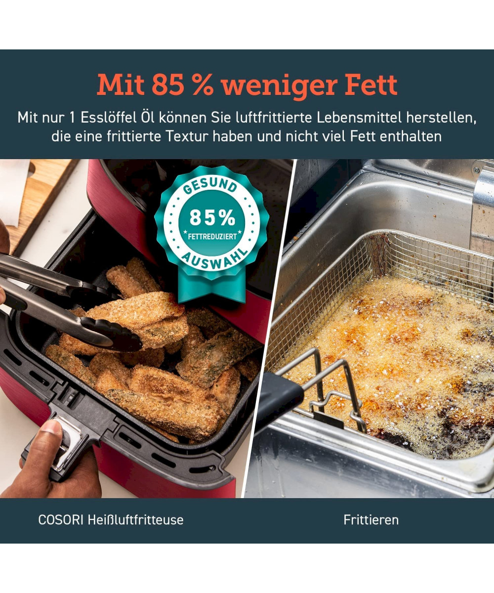 - Dadurch, dass kein extra Öl in der Cosori benötigt wird, gart Ihr das Essen nur im eigenen Saft und spart hierbei bis zu 85% Fett.