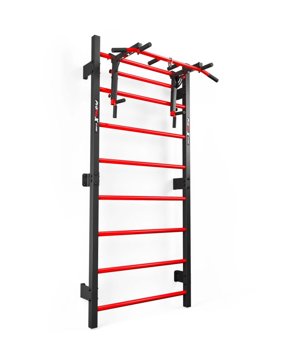 Erweitere deine Trainingsroutine: Mit der Klimmzugstange ist ein professionelles Rücken-, Schulter- und Bauchtraining möglich. Der Abstand zwischen der Klimmzugstange und der Sprossenwand beträgt 60 Zentimeter, sodass ein optimaler Trainingskomfort gewährleistet ist. -