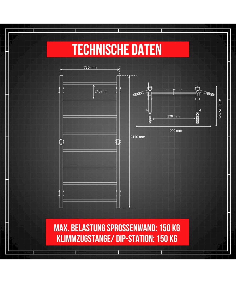 - Maße der Sprossenwand: 2.150 x 730 mm