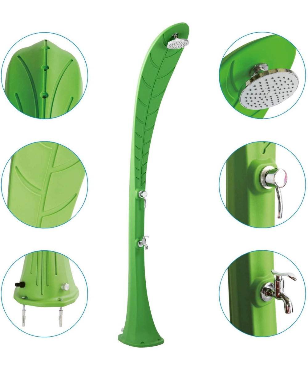 Die Steinbach Solardusche Leaf besticht durch Ihrer einzigartige Optik und fügt sich durch Ihr frisches Blattdesign ganz natürlich in Ihren Garten ein. Mit der 220 cm hohen Solardusche erhalten Sie durch die Kraft der Sonne kostenloses warmes Wasser. Der Kunststofftank fasst 23 l Wasser und ein großer selbstentkalkender Duschkopf bieten Ihnen ein angenehmes Duschvergnügen. Mit der Einhebel-Mischbatterie lässt sich das Wasser schnell und einfach auf die gewünschte Temperatur einstellen. Ein zusätzlicher Kaltwasser-Entnahmehahn, Anschluss für den Gartenschlauch und eine Ablassschraube für die Winterentleerung sind bei dieser einzigartigen Solardusche serienmäßig. Der maximale Betriebsdruck beträgt 3 bar.