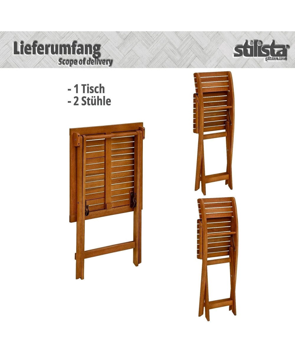 Das STILISTA® Bistro Set 3-tlg. bestehend aus einem Gartentisch und zwei Gartenstühlen, ist aus hochwertigem Akazienholz gefertigt