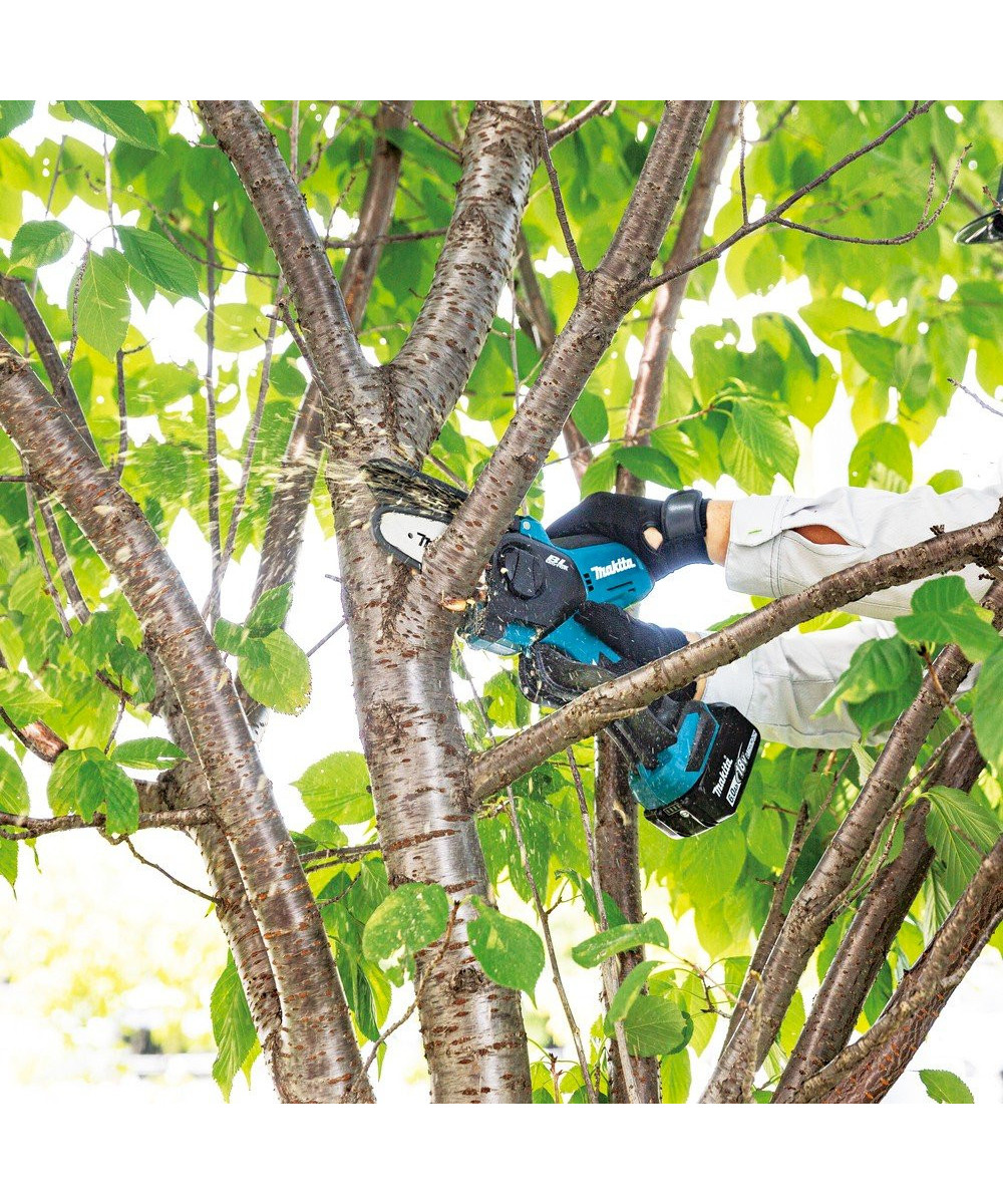 Mit einem Gewicht von 2,0 kg und einer Länge von nur 35,7 cm ist die Makita DUC101Z Akku-Astsäge ausgesprochen leicht und kompakt. Das macht es ganz einfach, Ihre Bäume zu entasten – selbst bei Arbeiten in der Baumkrone oder mit einer eingeschränkten Bewegungsfreiheit. Trotz ihrer kompakten Maße überzeugt die Akku-Astsäge durch eine hohe Kraftentfaltung. Sie arbeitet mit 18 Volt und erzeugt eine Kettengeschwindigkeit von 8 m/s. Die hochwertige Sägekette 1910V6-4 Speed Cut trägt zu einer hohen Schnittgeschwindigkeit bei.