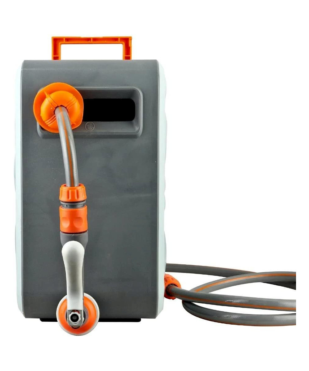 Inklusive 30m Schlauch haben Sie einen Aktionsradius von 60m in Ihrem Garten. Diese Automatik-Schlauchtrommel sorgt für Ordnung und macht Schluss mit verdrehten Gartenschläuchen. Der mitgelieferte Gewebeschlauch ist dank der Einzugsautomatik immer ordentlich aufgerollt. Dabei rastet die Aufrollautomatik praktischerweise an jeder Stelle gleich ein. Das heißt, es wird nur soviel Schlauch abgerollt wie auch wirklich benötigt wird, ohne dass der Schlauch automatisch zurück zieht. Das automatische Aufrollen wird durch einen kurzen Zug am Schlauch ausgelöst der dann vollautomatisch bis zum Anschlag aufgerollt wird. Selbstverständlich sind Schnellkupplungsanschlüsse 1/2", ein Wasseranschluss und eine Spritze enthalten.