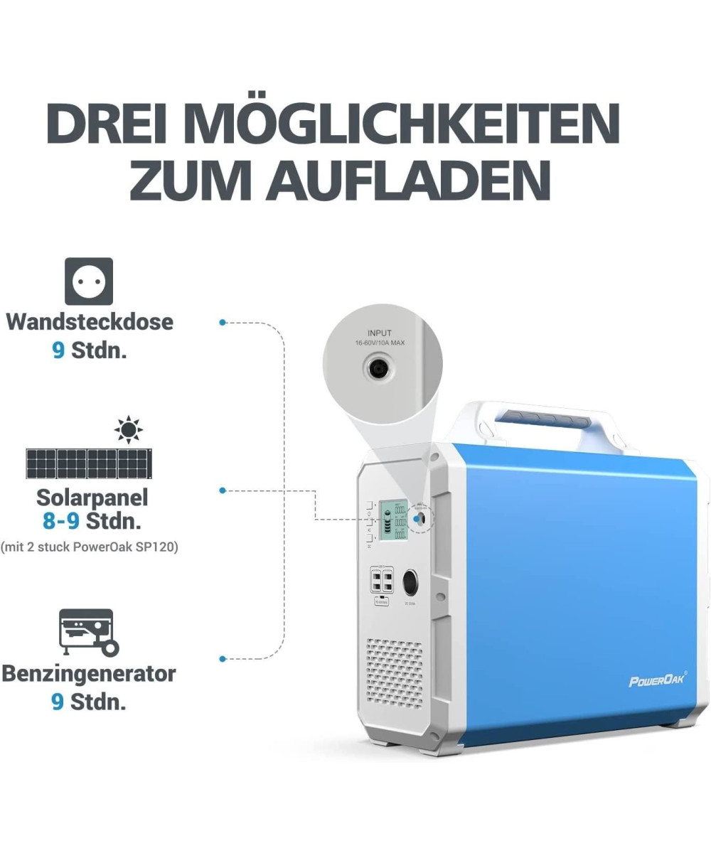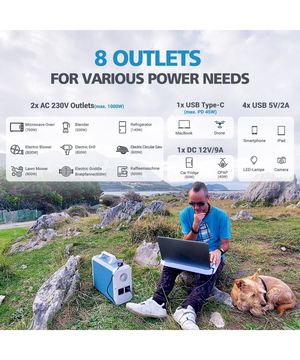 Für Notebooks und kleine Kühlschränke können zwei AC 230V Steckdosen (maximal 1000W, reiner sinusförmiger Inverter) verwendet werden. Eine DC 12V /9A automatische Steckdose (stabiler 12V) kann für die Bordausrüstung verwendet werden. Vier USB-a 5V / 3A können für kleine elektronische Geräte wie Mobiltelefone verwendet werden. 1 usb-c (maximale PD 45W) für schnelles Laden und Zeitersparnis. Mit diesen Steckdosen kann poweroak EB180 Generator perfekt genutzt werden, um verschiedene elektronische Produkte zu laden oder verschiedene elektrische Geräte mit Nennleistung unter 1000W zu betreiben.