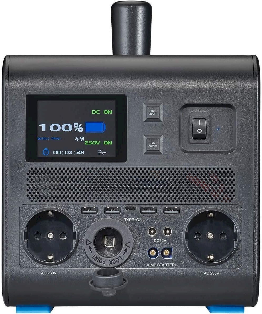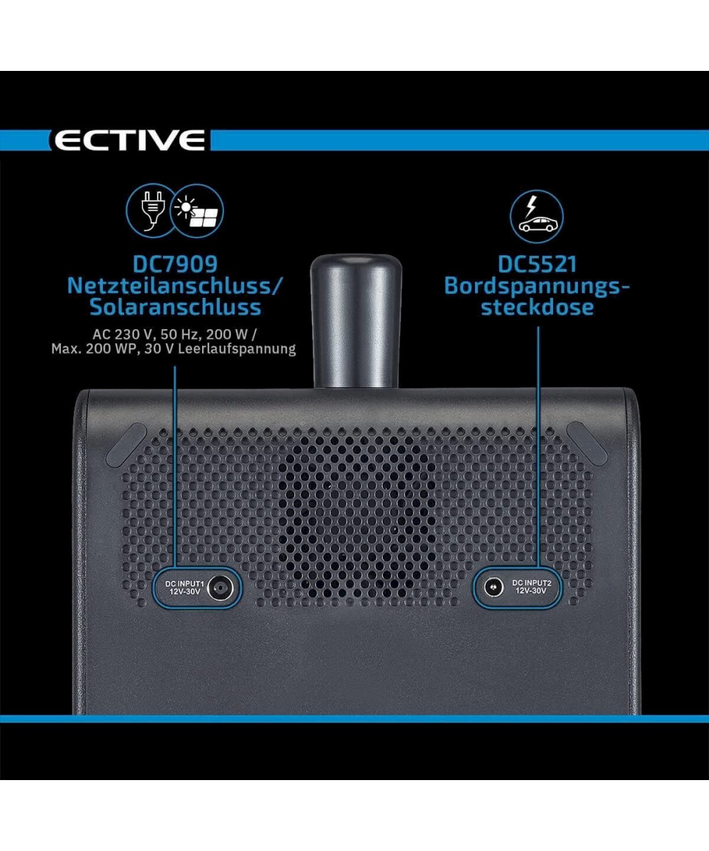 - Gleichstromausgänge : 4 × USB-Port | 1 × USB-C-Port | 2 × DC-Ausgang I 1 × Bordspannungssteckdose (12 V)